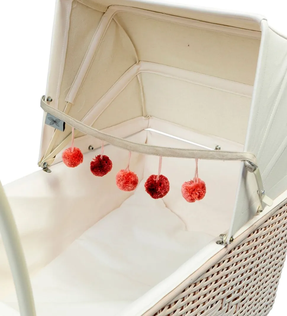 Smart by ASTRUP barnevognskæde, bestående af et hvidt bånd med fem pomponer i rosa og røde nuancer.
