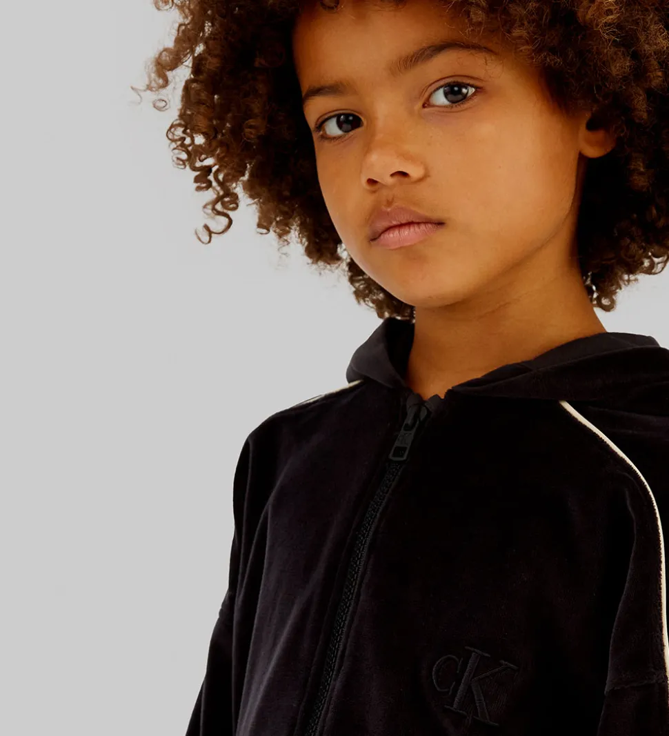 Flot Calvin Klein cardigan i sort velour med stilfulde piping-detaljer i en lys kontrastfarve. Cardiganen fra Calvin Klein har lange ærmer, ribkant ved håndled og forneden samt en praktisk lynlås foran. Hætten har et bomuldsfor, og fortil er et broderet cK-logo der tilføjer et klassisk touch.