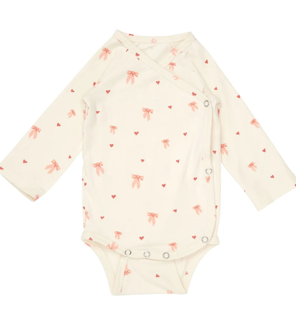 Fin Cam Cam body i lys rosa med print af rosa sløjfer og røde hjerter. Bodyen har lange ærmer og et praktisk slå-om design med trykknapper langs siden samt mellem benene.