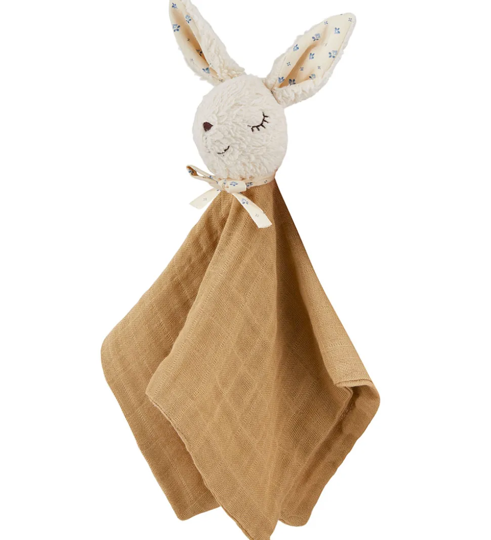 Sød Cam Cam Copenhagen nusseklud i honninggul med et hvidt kaninhoved og med ører og en butterfly i et blåblomstret mønster.