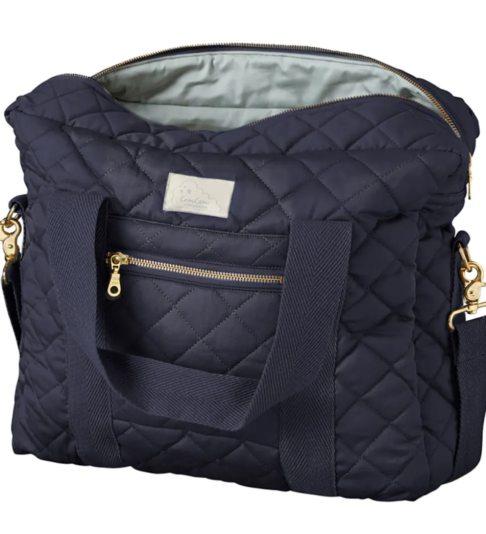 Fin Cam Cam Copenhagen pusletaske i navyblå. Pusletasken har en quilted struktur, og den har guldfarvede metalspænder og -lynlås. Foret er lysegråt.