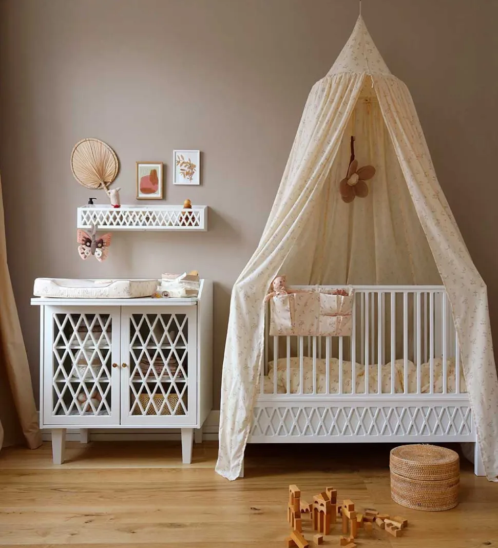 Cam Cam Copenhagen sengehimlen kan skabe en rigtig fin hyggekrog på børneværelset. Den har en metalring øverst, så den kan hænges op f.eks. over en seng.