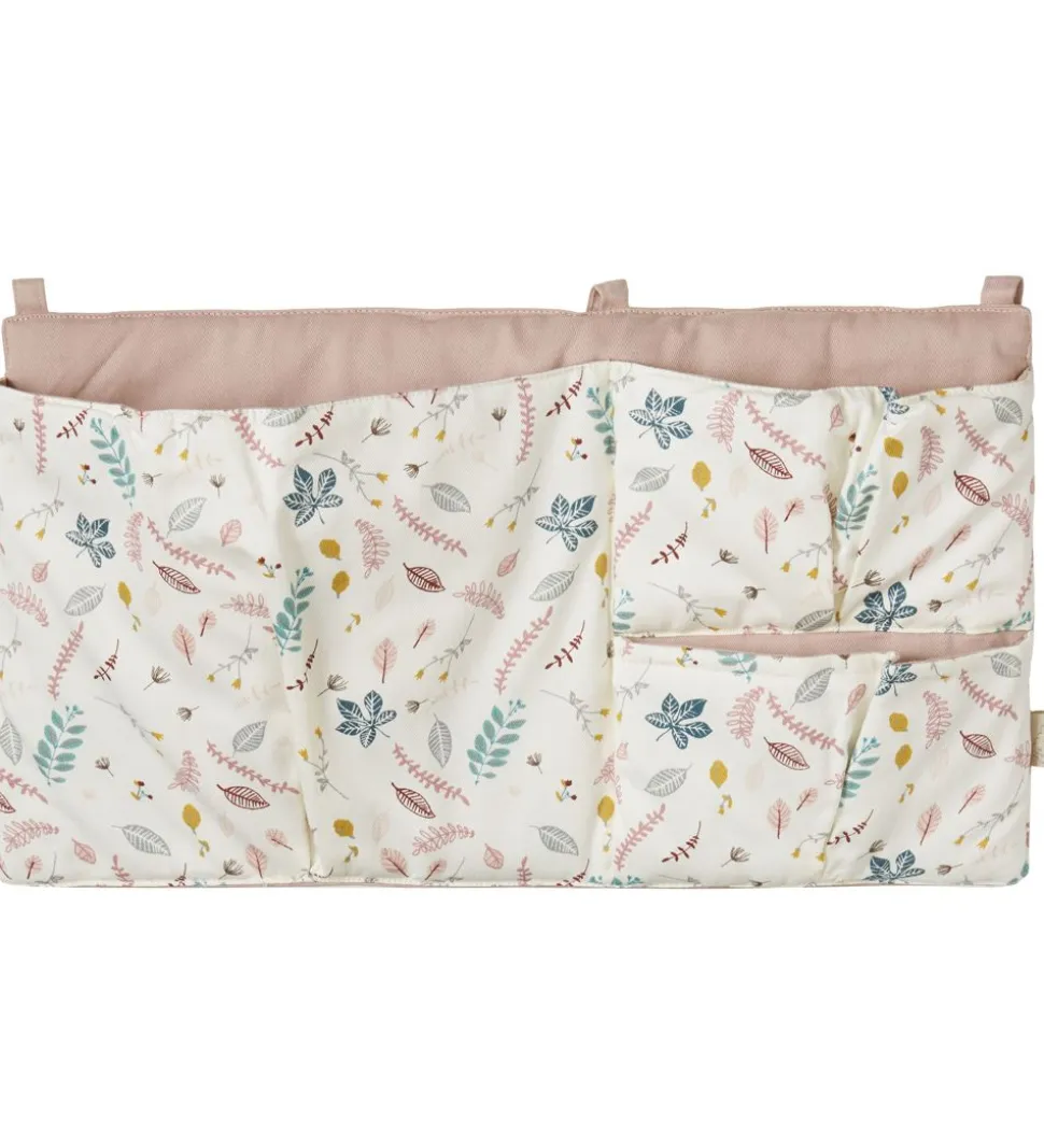Skøn Cam Cam Copenhagen sengelomme i hvid og rosa med et allover print af blade i rosa, gule og blå nuancer.
