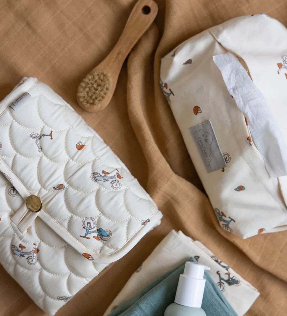 Flot Cam Cam Copenhagen vådserviet etui i beige med et alloverprint af fine, små cykler i blå, grønne og brune nuancer