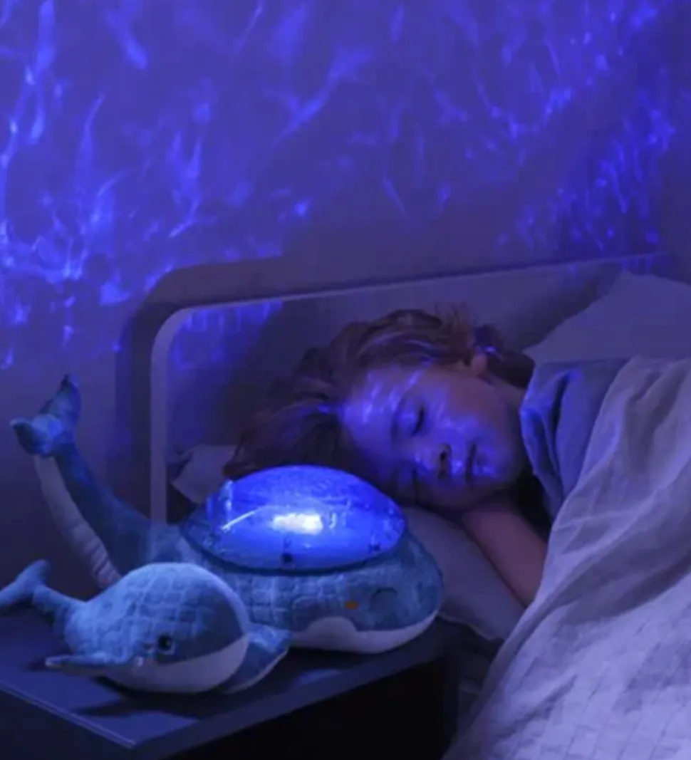 Flot Cloud-B natlampe formet som hval i blå nuancer og med en top af gennemsigtigt plast. Der medfølger en lille hvalunge, som kan bruges som rangle.