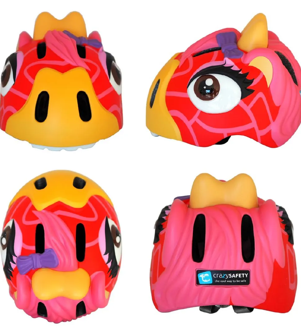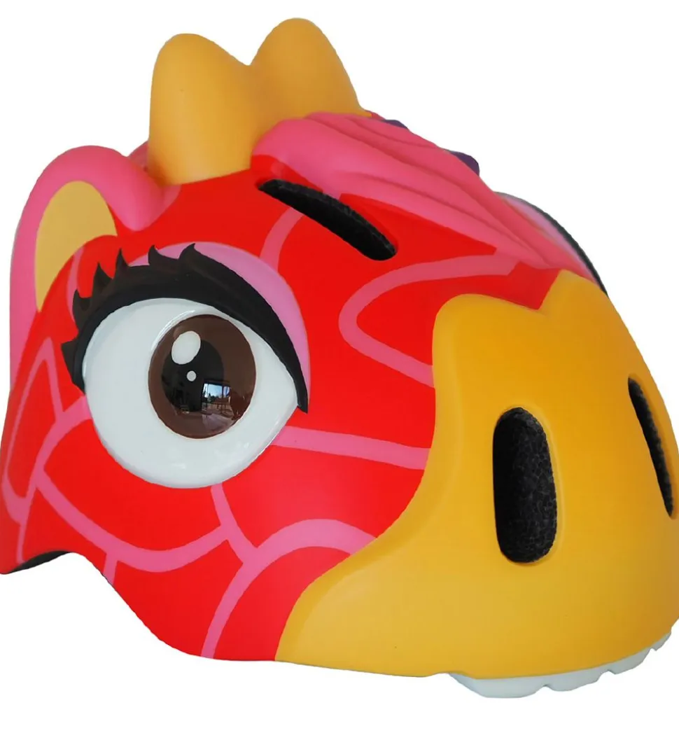 Sjov Crazy Safety cykelhjelm i rød og gul, med form som en giraf.