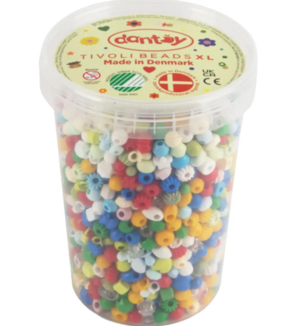 Dantoy perlerne har et stort hul, så de er nemme at sætte på en elastik uden brug af nål. Den medfølgende elastiksnor og perlernes fine farver og former kan bruges til at skabe flotte halskæder, armbånd og meget mere.