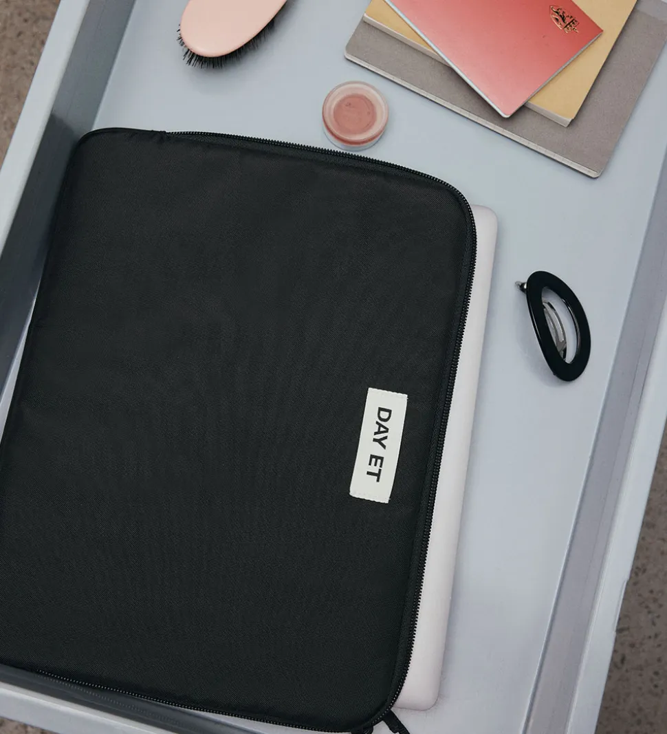 Flot DAY ET computersleeve i sort med et hvidt logopatch på fronten med teksten “DAY ET”.