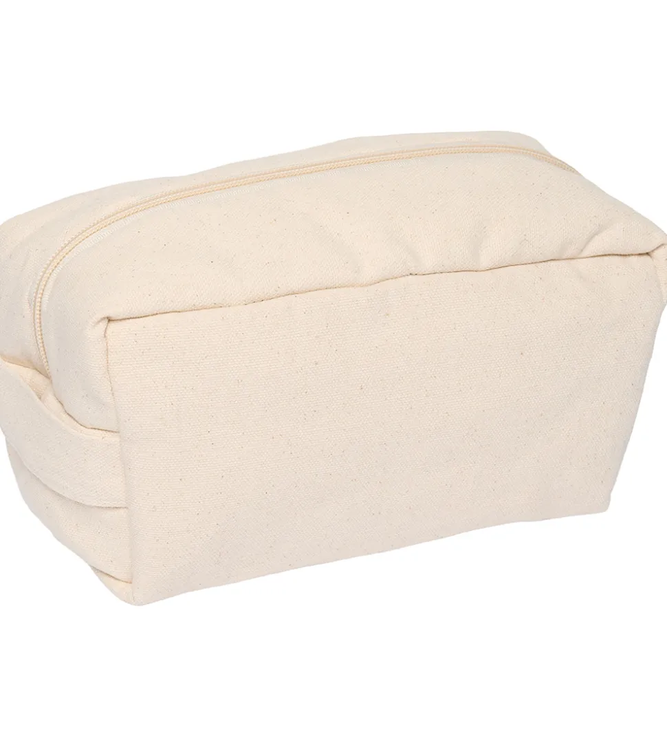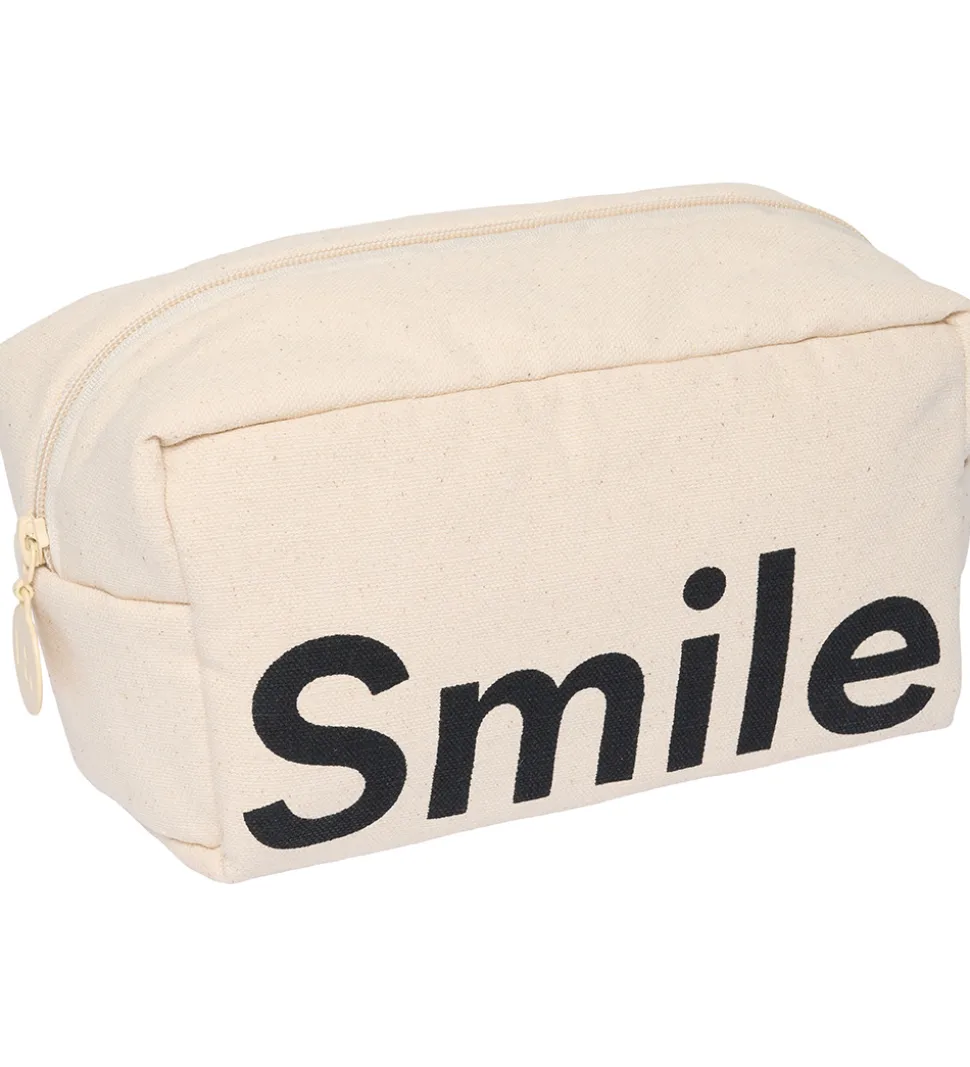 Lækker Design Letters toilettaske i naturfarvet bomuld, og på den ene side står der “Smile” trykt i sort.