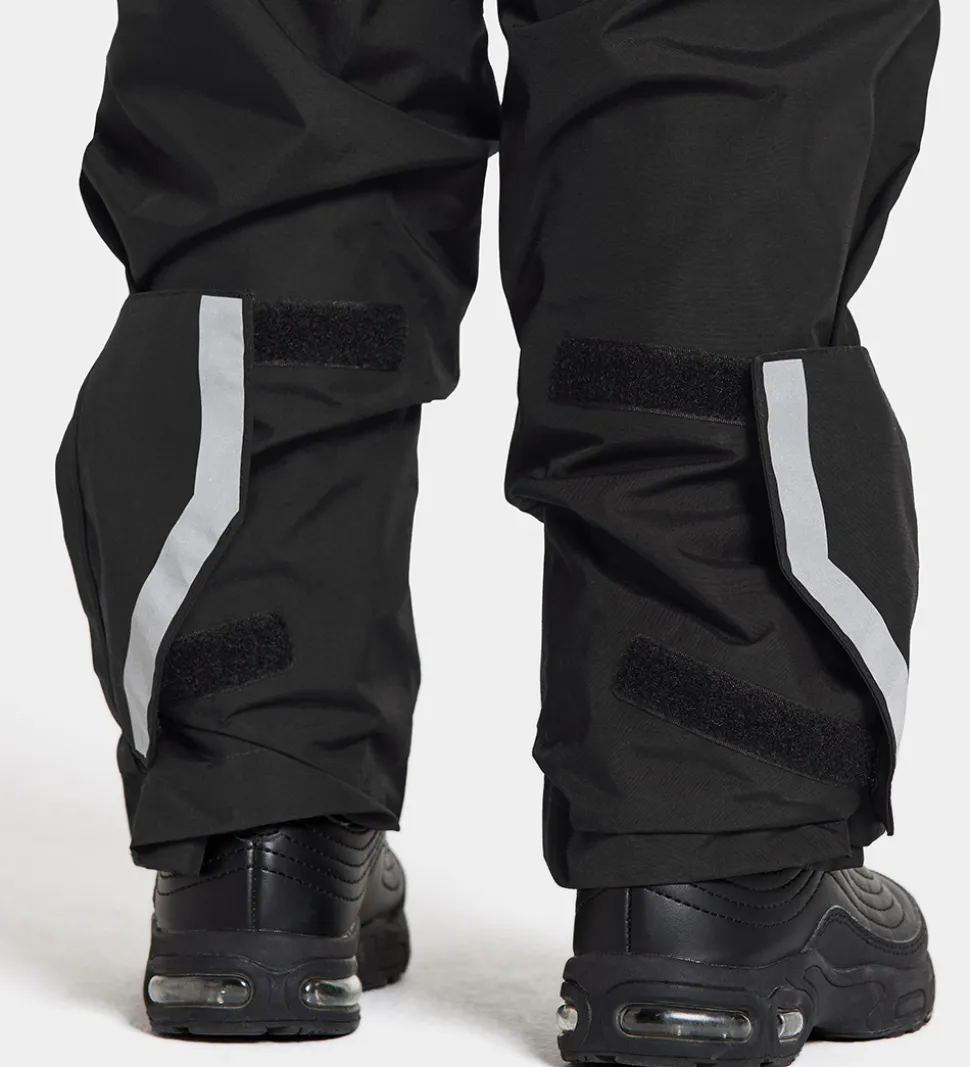 Didriksons skalbukserne har en bred elastikkant i livet, som kan justeres med en elastiksnøre på indersiden. Skalbukserne er også forsynede med velcrostropper, som gør det muligt at fastgøre seler