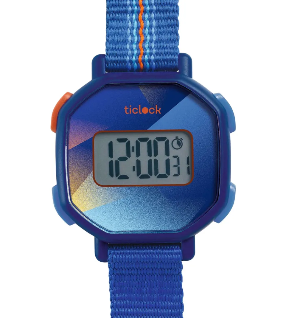 Flot Djeco armbåndsur i blå med lyseblå og orange knapper og et grafisk print i forskellige farver på urskiven.