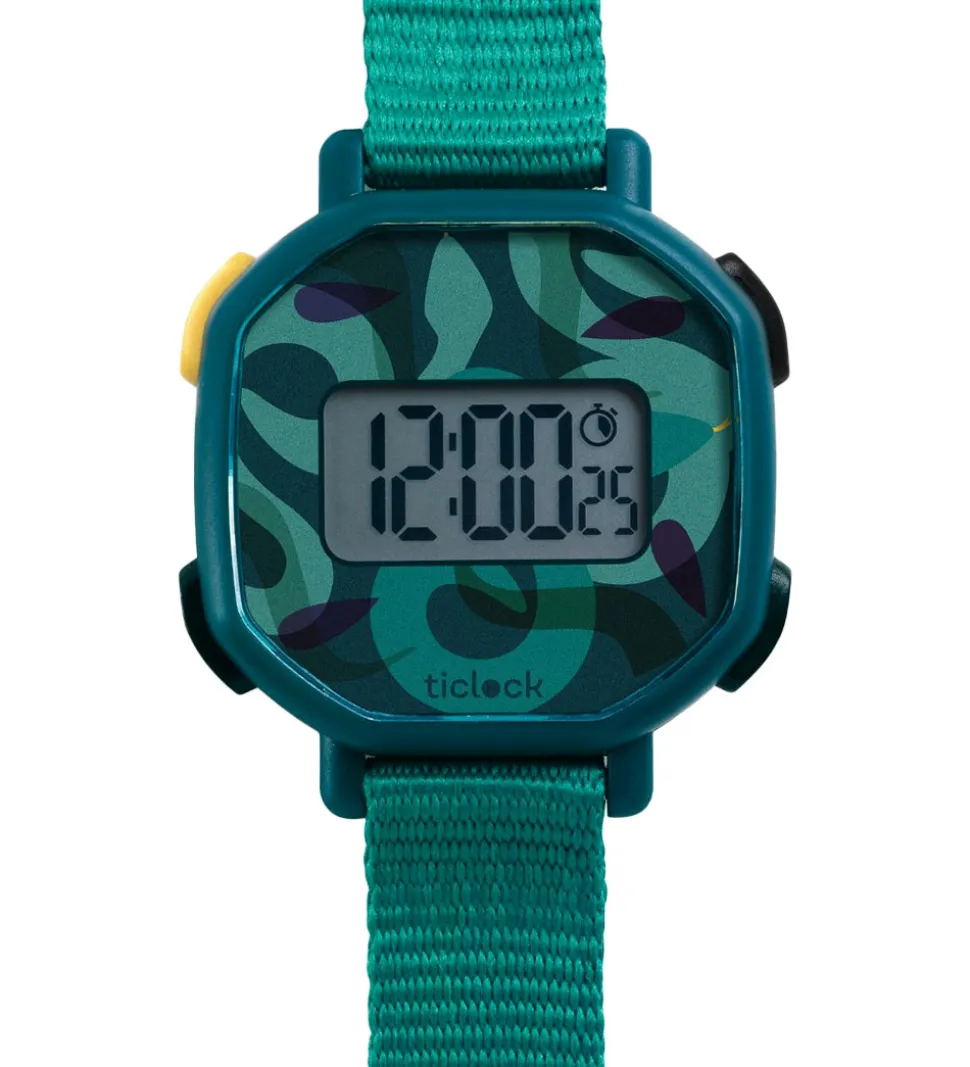 Flot Djeco armbåndsur i mørkegrøn med sorte og gule knapper og et slangeprint på urskiven.