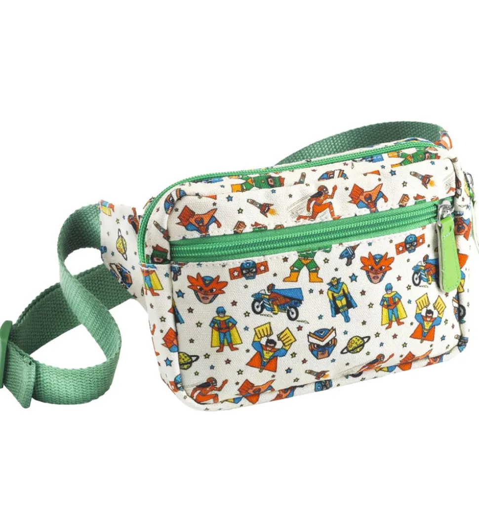 Smart Djeco bæltetaske i jvid med et alloverprint med superhelte i klare farver, og den har grønne lynlåse og rem.