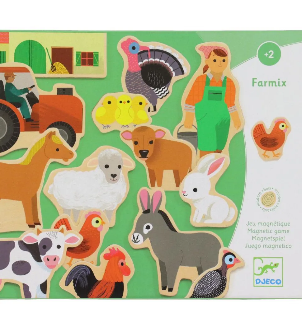Sødt Djeco magnetspil bestående af 24 magnet med et bondegårdstema.