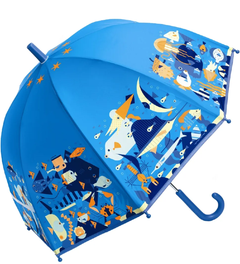 Flot Djeco paraply i blå med print af havet og dets dyr langs kanten.