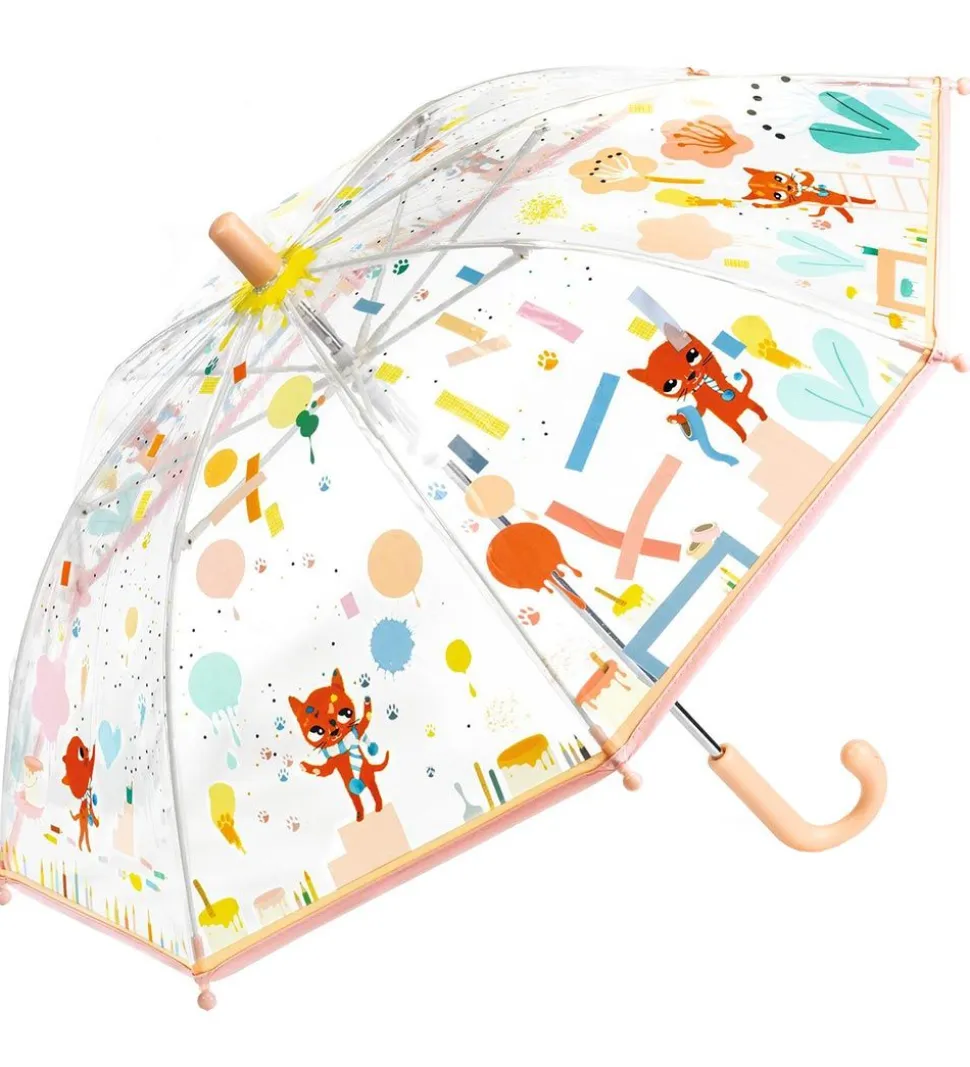 Flot Djeco paraply i gennemsigtigt, blødt plast med print af en brun kat, som laver forskellige numrer og med et ferskenfarvet håndtag.