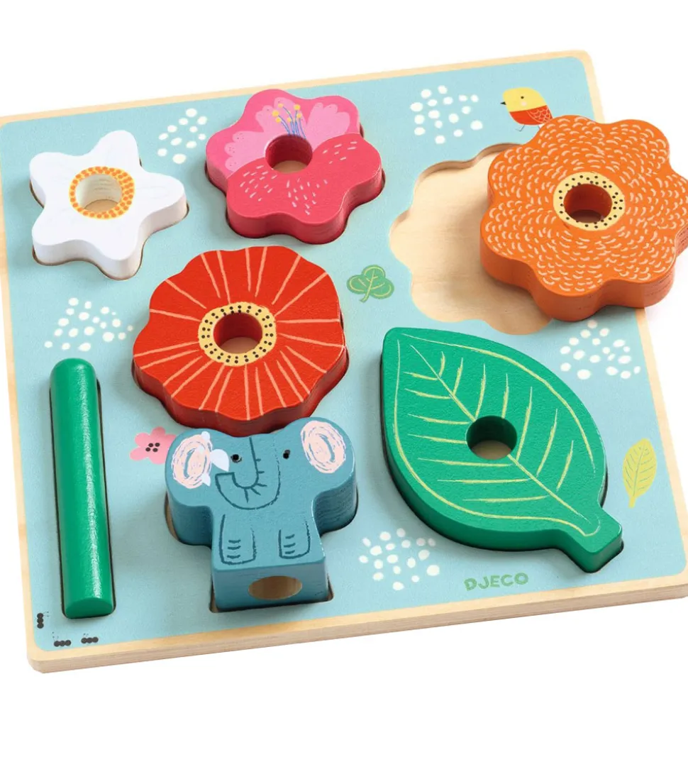 Sjovt Djeco puslepil af træ, med motiver af forskellige dyr og blomster.
