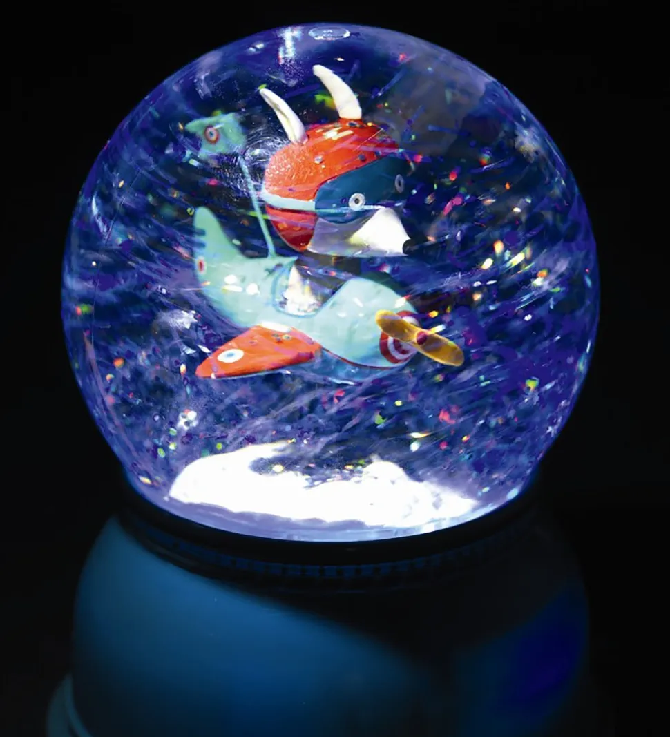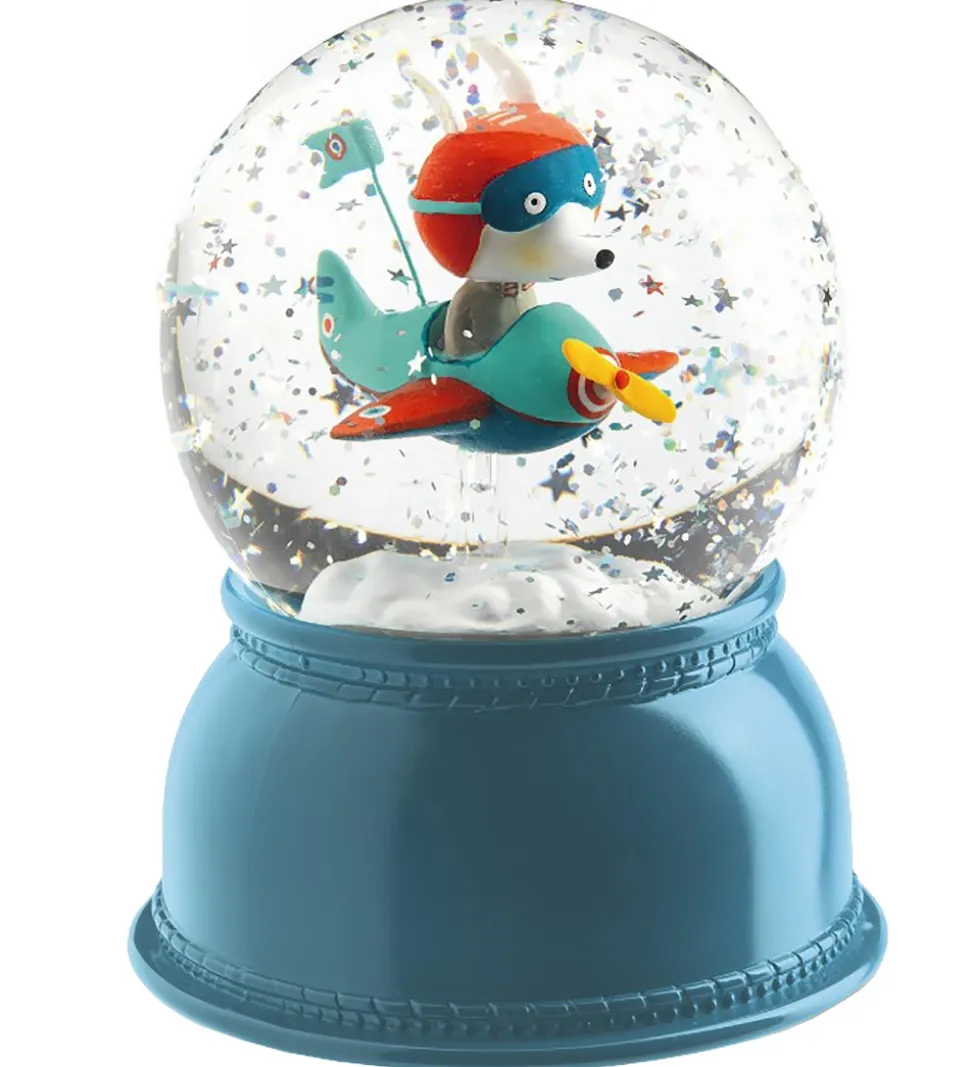 Skøn Djeco snekugle med en bund i petroleumsblå, og inde i glaskuglen er der en hund, som flyver i en flyvemaskine i blå nuancer.