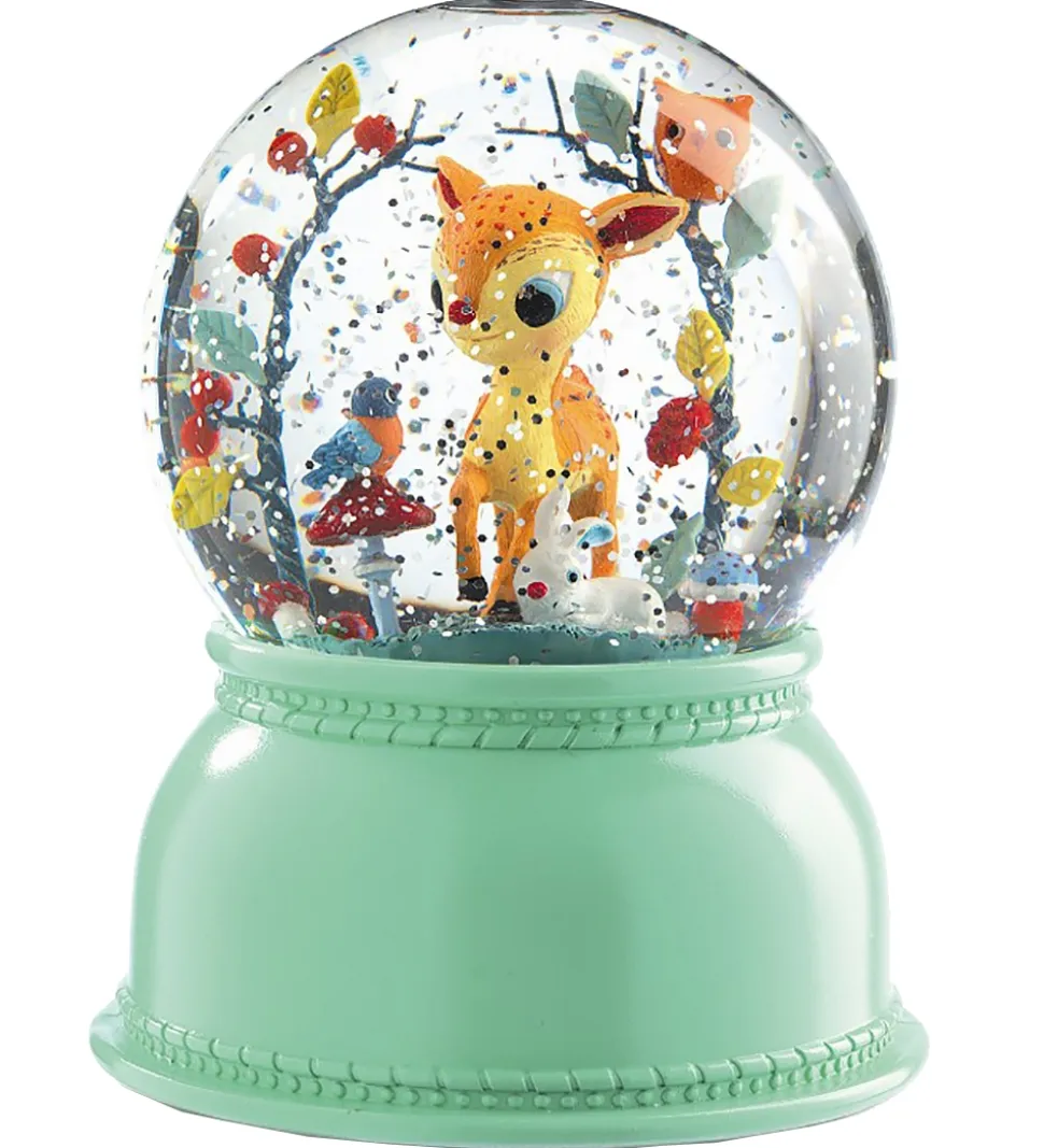 Skøn Djeco snekugle med en bund i mintgrøn, og inde i glaskuglen er der et dådyr omgivet af planter med farverige blade.