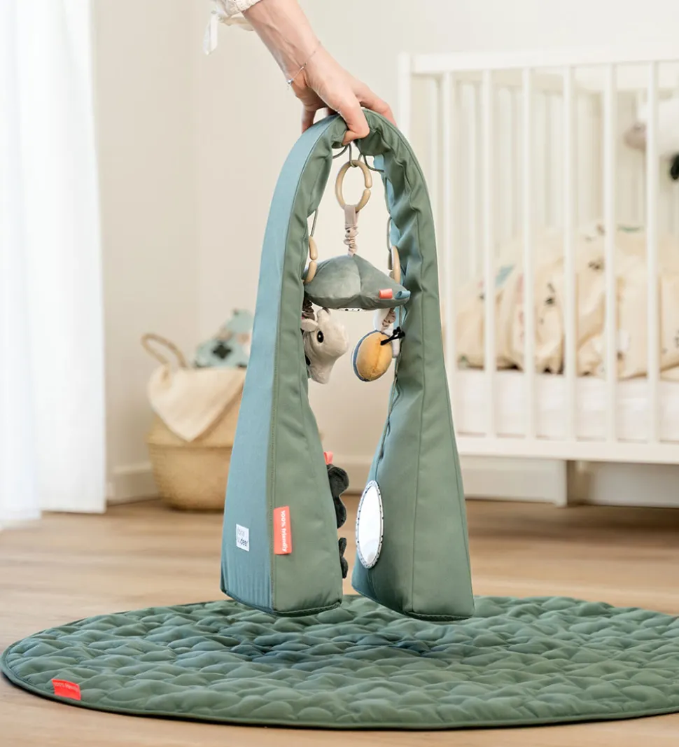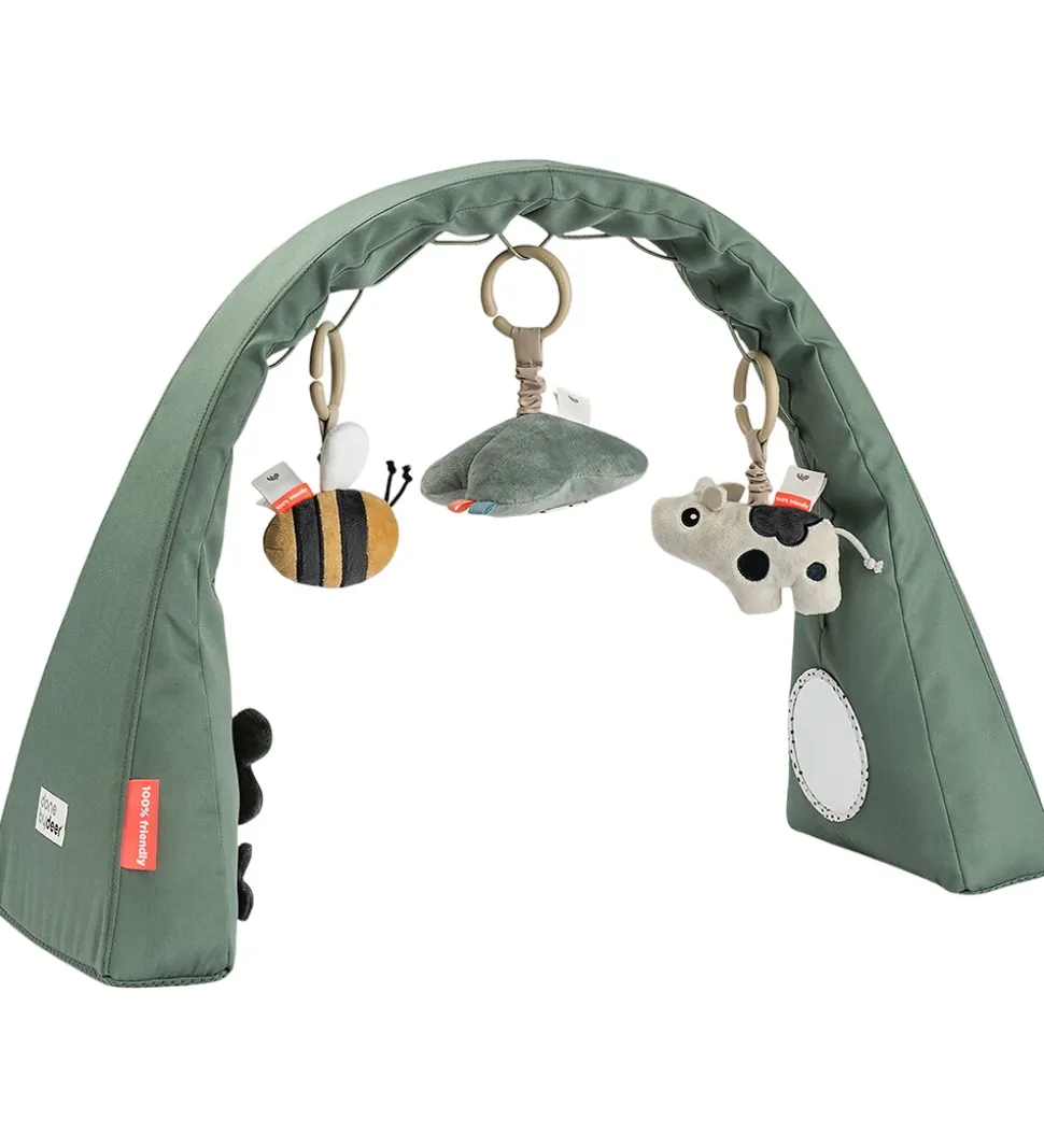 Underholdende Done by Deer aktivitetsstativ i grøn med forskellige aktiviteter, som stimulerer barnets sanser.