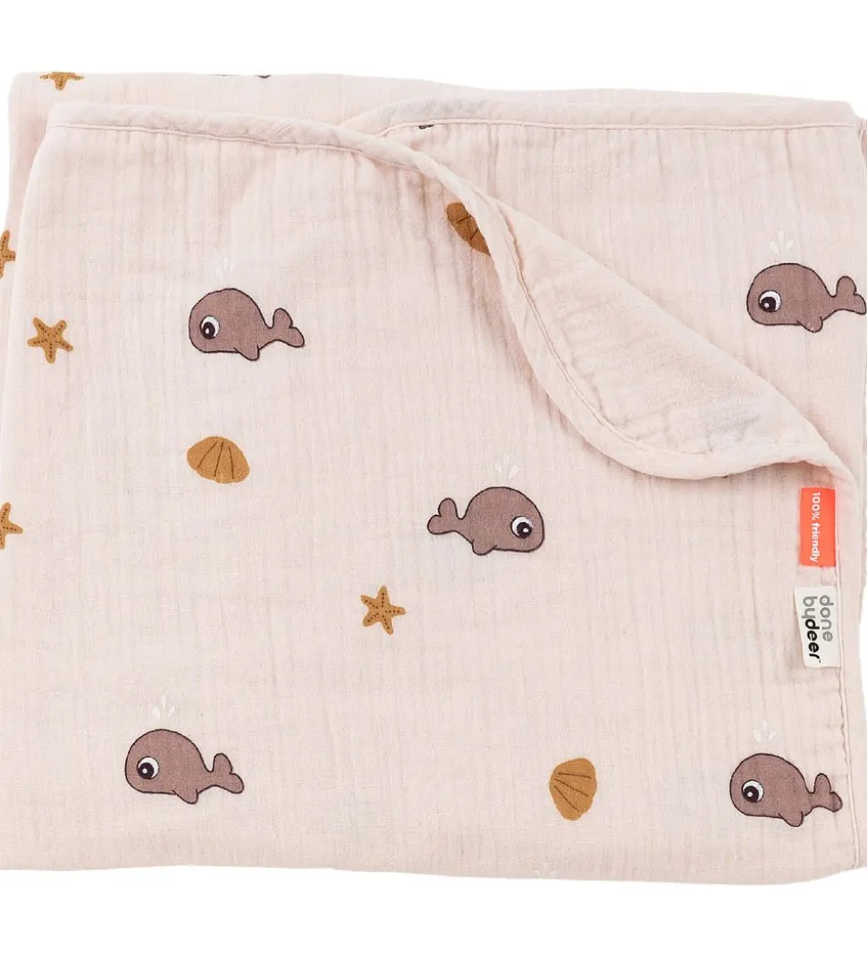 Skønt Done by Deer babysvøb i pudderrosa med et allover print af søde hvaler, muslinger og søstjerner i rosa og brune nuancer.