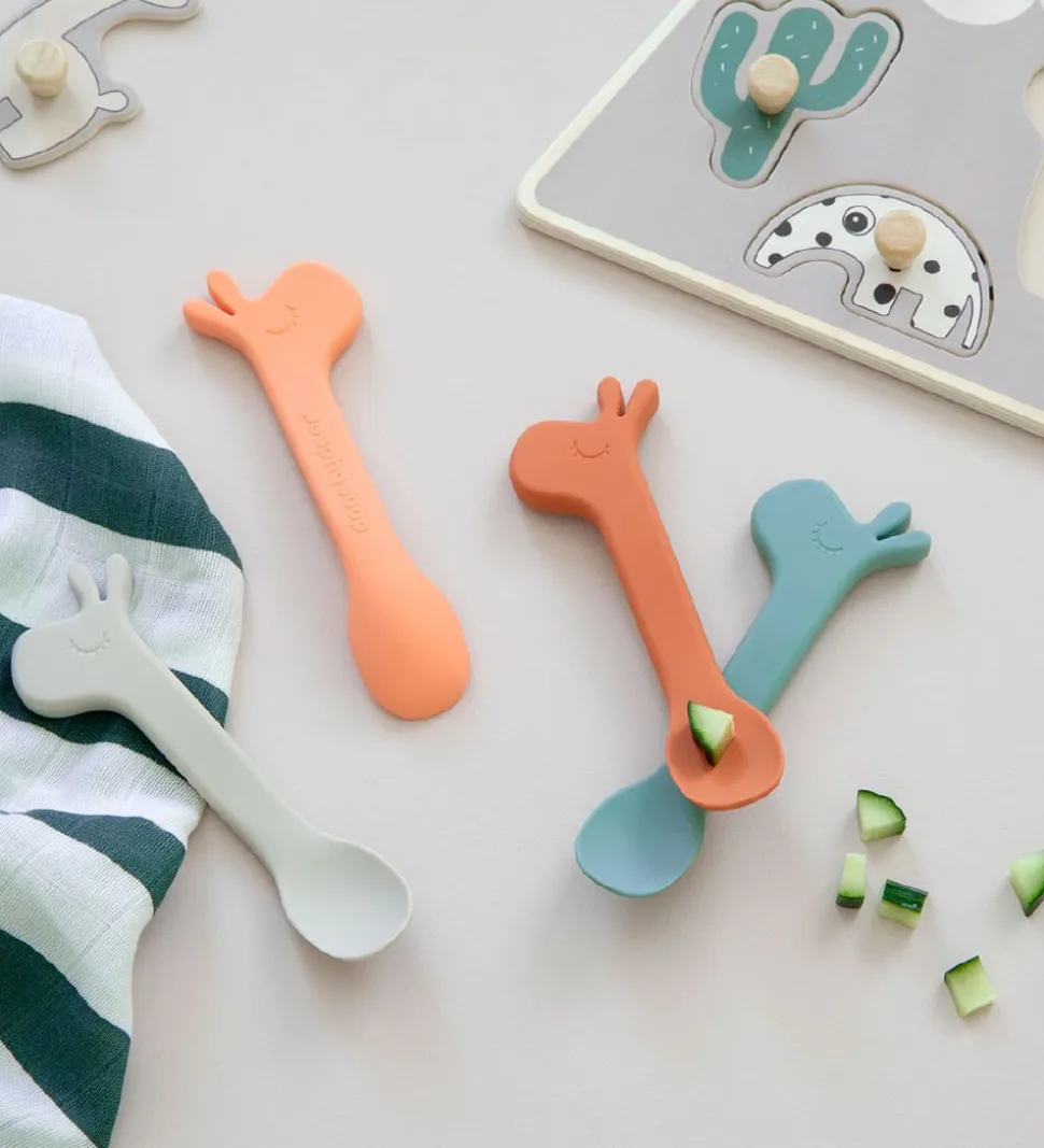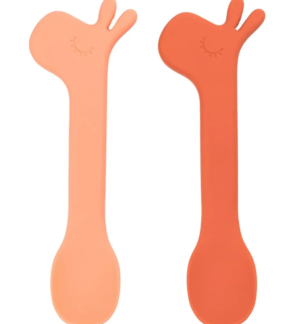 Gode Done by Deer skeer solgt i en 2-pak i to forskellige orange nuancer og med en giraf på enden af skeen.