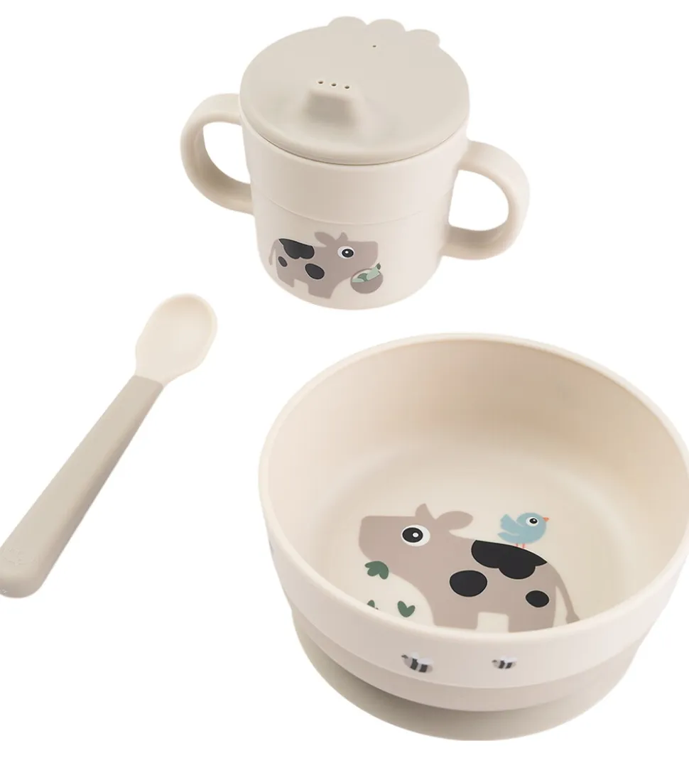 Smart Done By Deer spisesæt bestående af en skål med sugekopbund, en tudekop med håndtag og aftageligt låg samt en ske. Det hele er i lysebeige med print af Done By Deer dyrene.