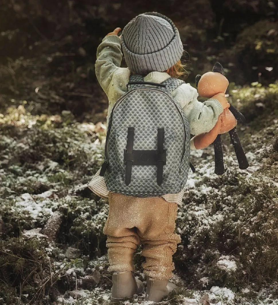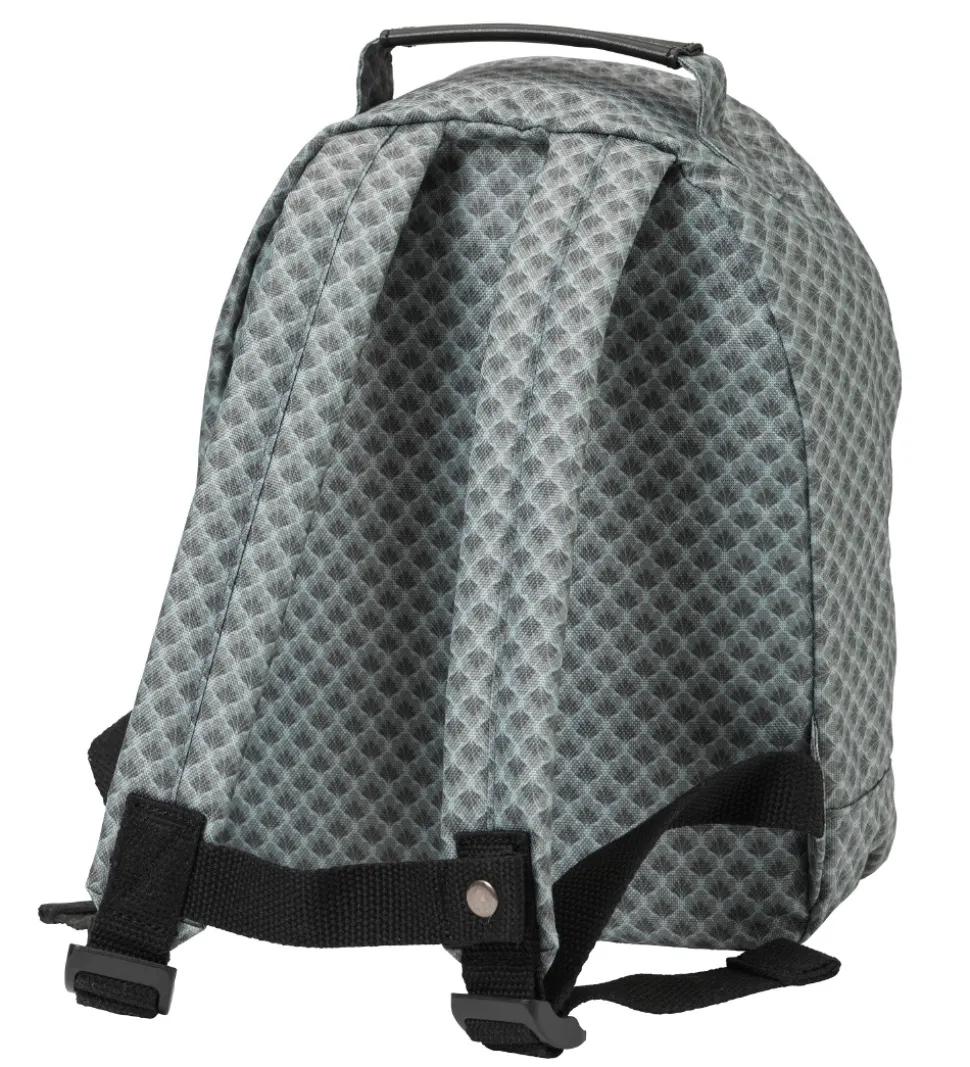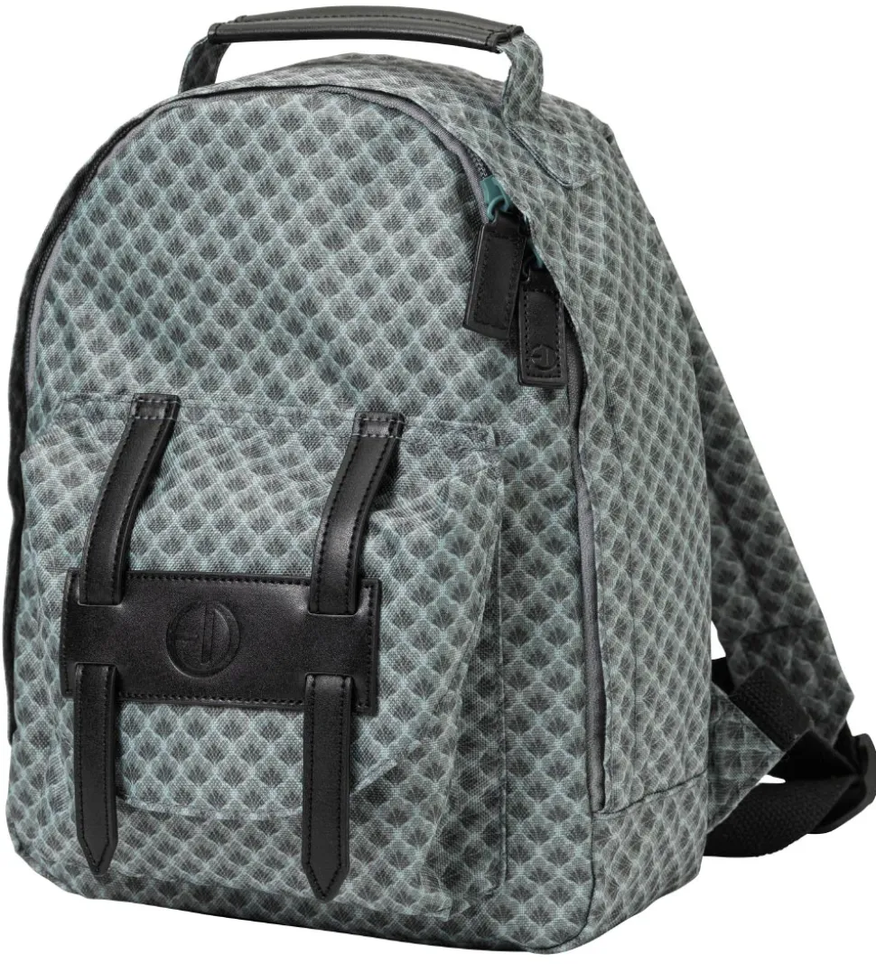 Smart Elodie Details børnehavetaske i turkis, med et mønster som ligner muslinger og flotte, sorte læder-detaljer.
