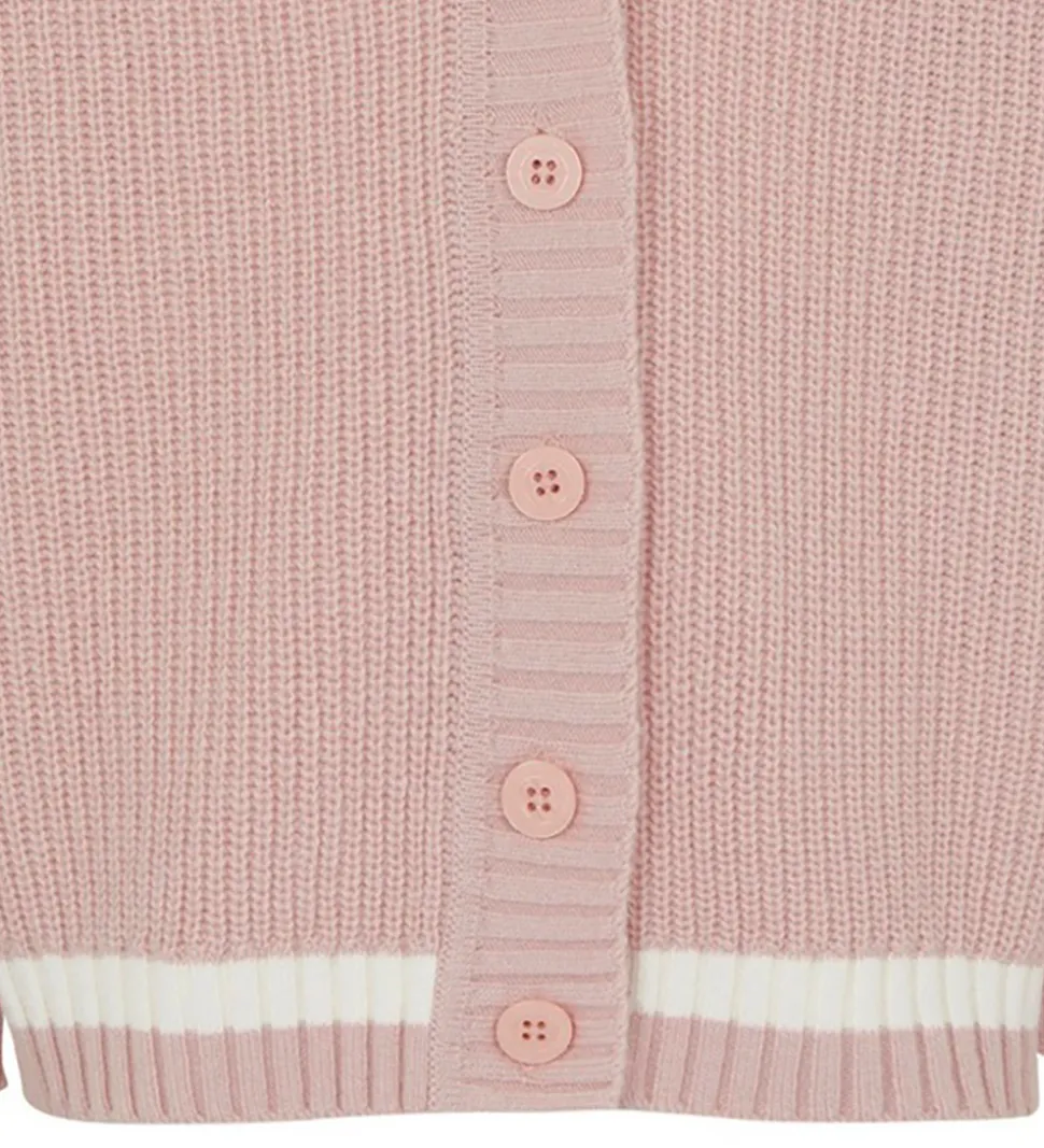 Stilfuld Emporio Armani cardigan i en sart rosa farve med lange ærmer. Cardiganen er lavet i en strikket kvalitet med en flot ribstruktur, der skaber et klassisk look. Emporio Armani cardiganen har V-udskæring og lukkes med knapper i matchende farve foran. Ribkanterne ved ærmerne og i bunden har fine hvide striber samt et lille logo, der tilføjer et subtilt touch.