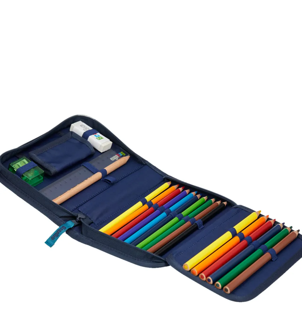 Ergobag penalhuset åbnes med en lynlås, og det indeholder masser af tilbehør i god kvalitet fra Lyra.