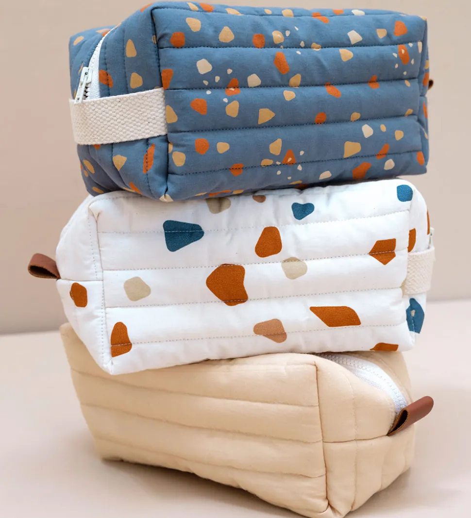 Flot Fabelab toilettaske i støvet blå med et alloverprint i brune og beige nuancer. Toilettasken er i et dyne-design med lodrette syninger og en let vattering.