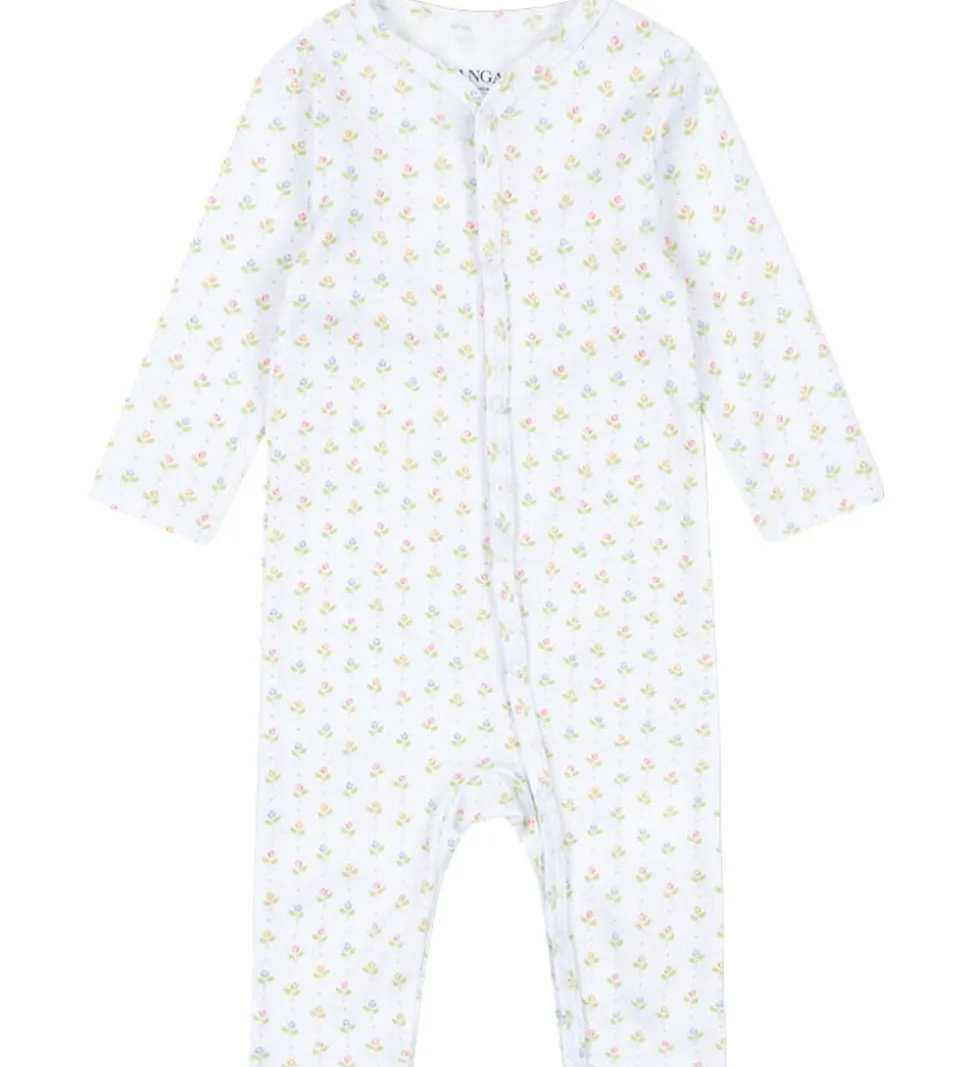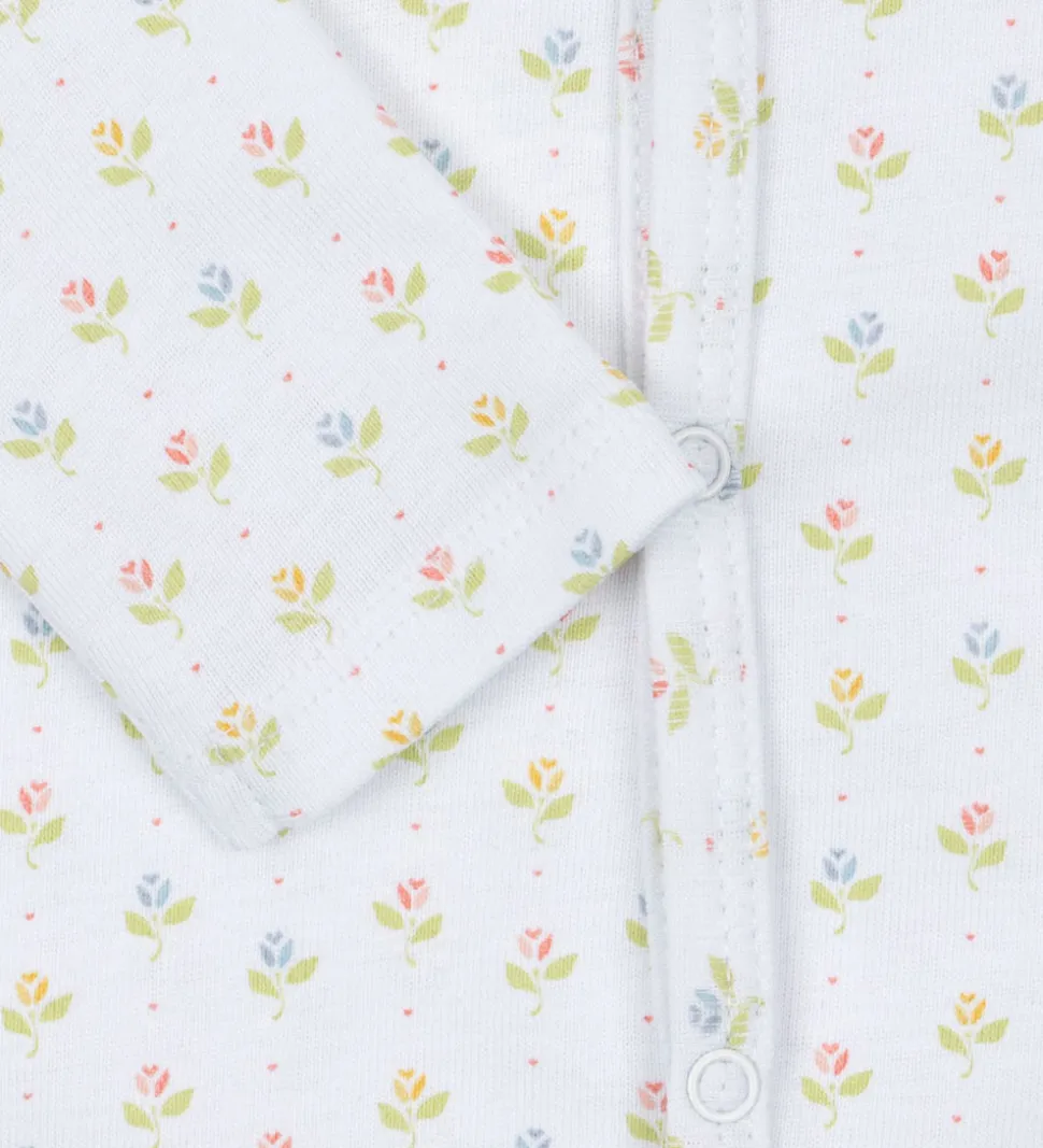 Skøn natdragt fra Fanga Fontana med lange ærmer i hvid og med et farverigt blomstermønster. Natdragten har en praktisk, asymmetrisk trykknaplukning foran, som gør den nem at åbne og lukke.