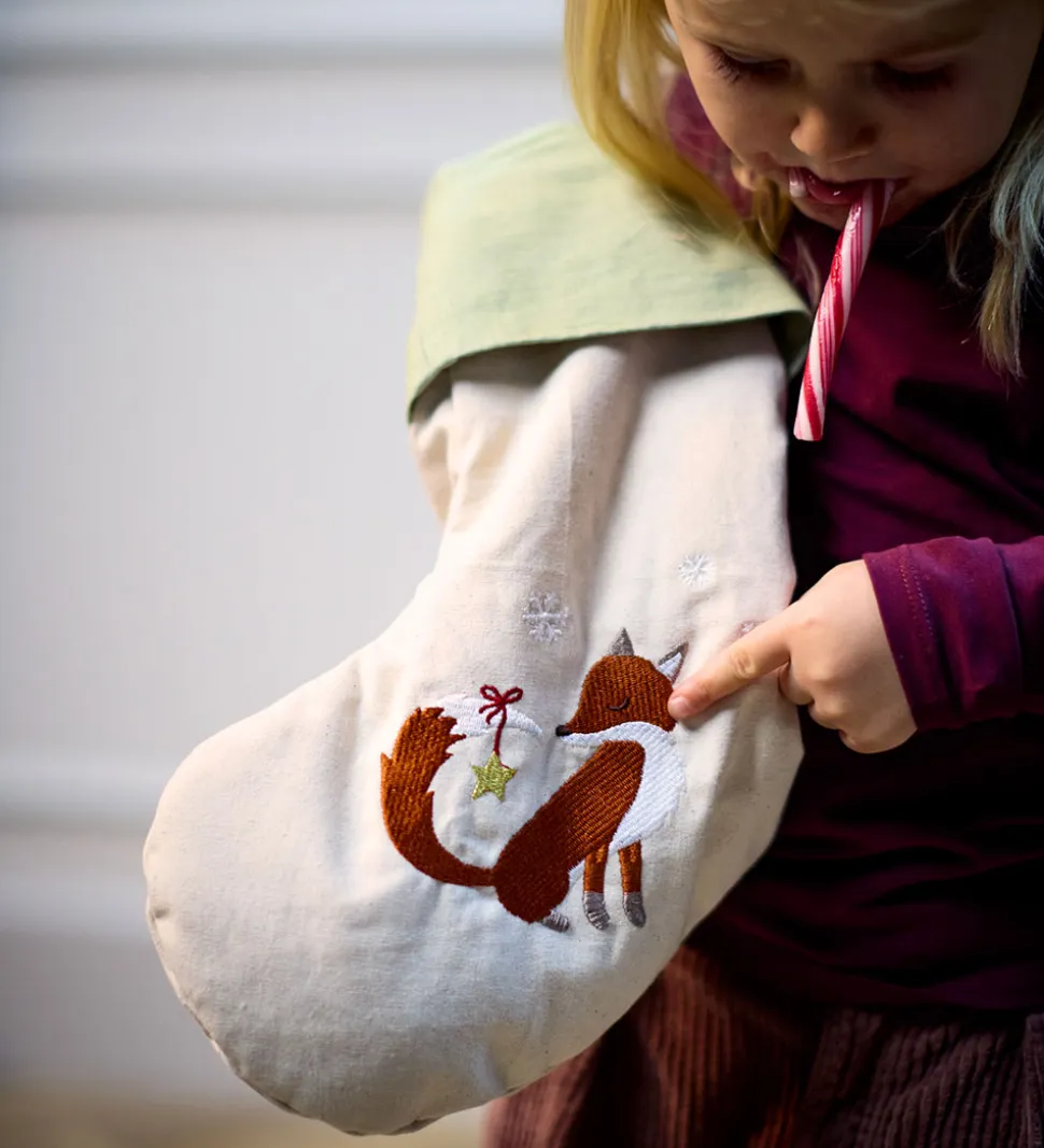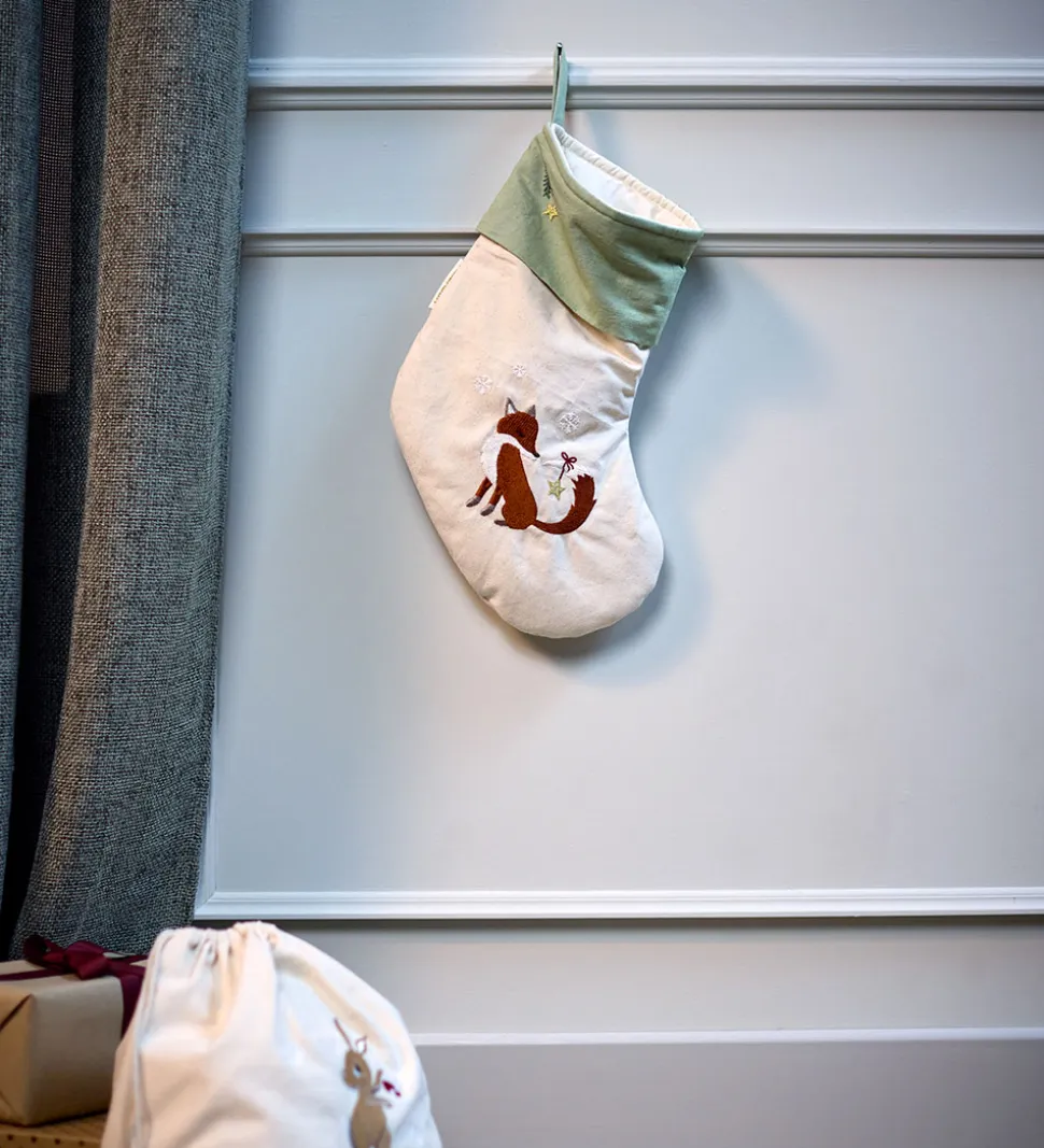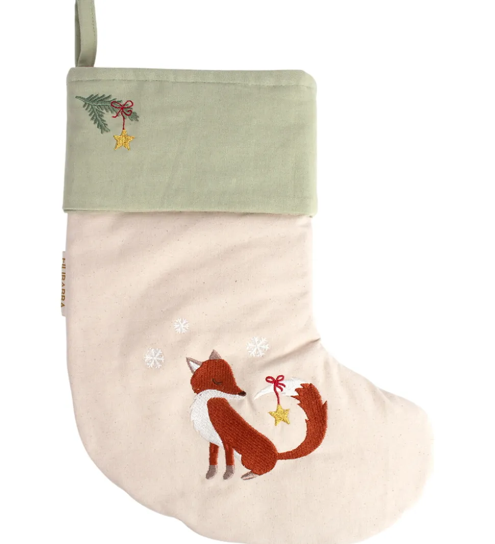Charmerende Filibabba julesok i lys beige med en broderet ræv med en stjerne på halen og små snefnug. Øverst er der en bred, grøn kant med en broderet gren med en guld stjerne. Julesokken har en hank i den ene side, så den let kan hænges på et håndtag eller lignende.