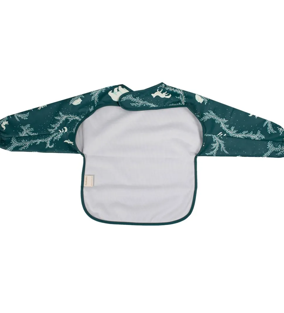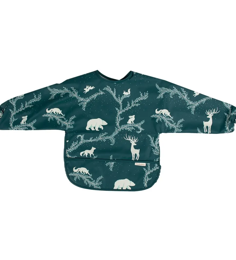 Filibabba forkldet har lange ærmer og åbnes i nakken, med praktisk velcro. Fortil er der en lomme i bunden, til at opsamle spildt mad og drikke. I armåbningerne er der smalle elastikkanter og indvendigt er der blødt for.