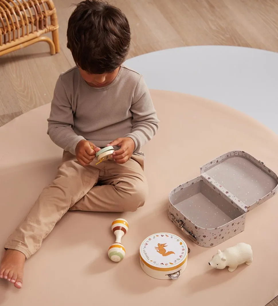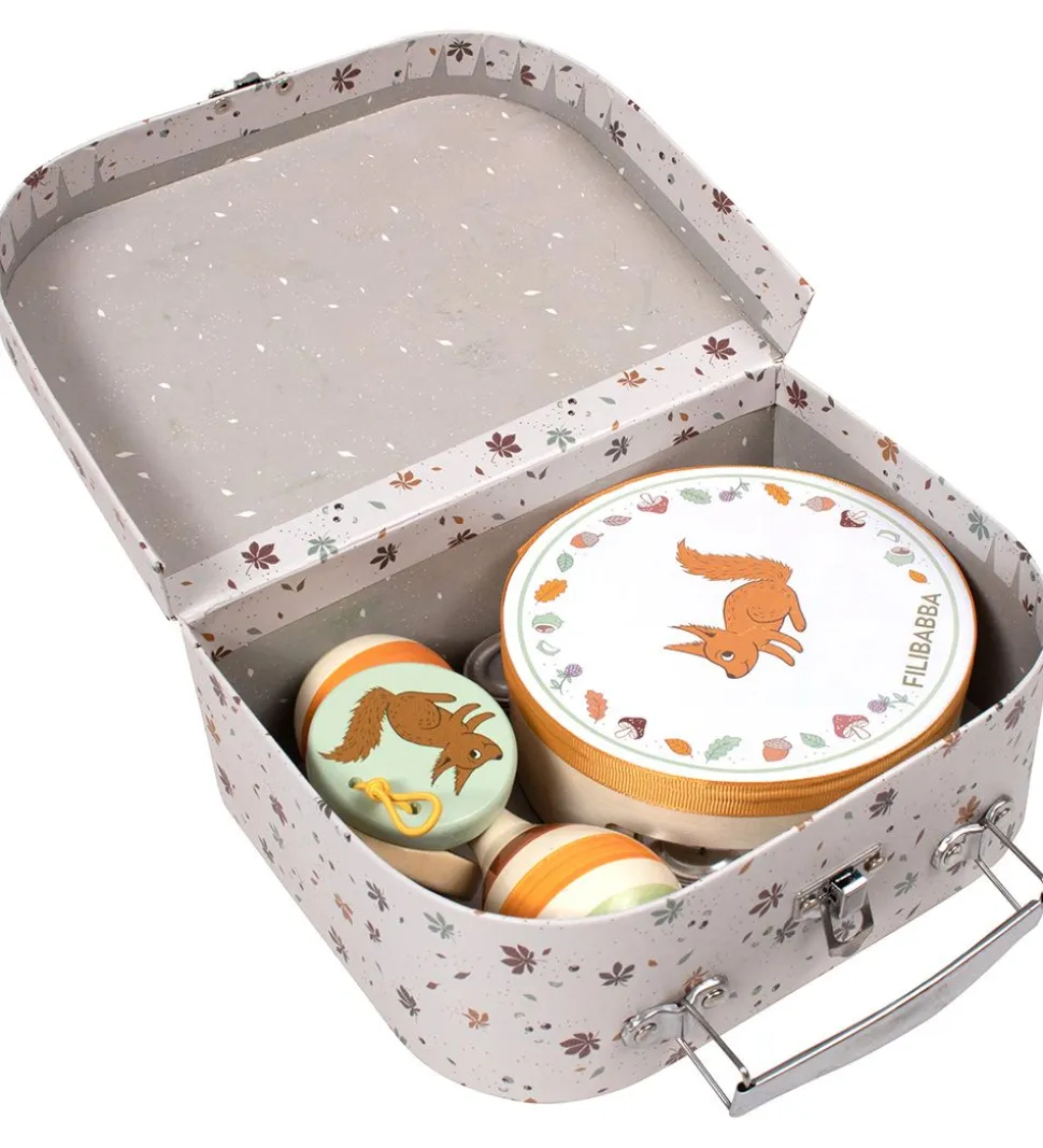 Filibabba legekufferten åbnes med et spænde og i toppen er der et praktisk håndtag. Kufferten indeholder tre instrumenter i poppel- og bøgetræ, som helt sikkert vil fange dit barns opmærkesomhed.