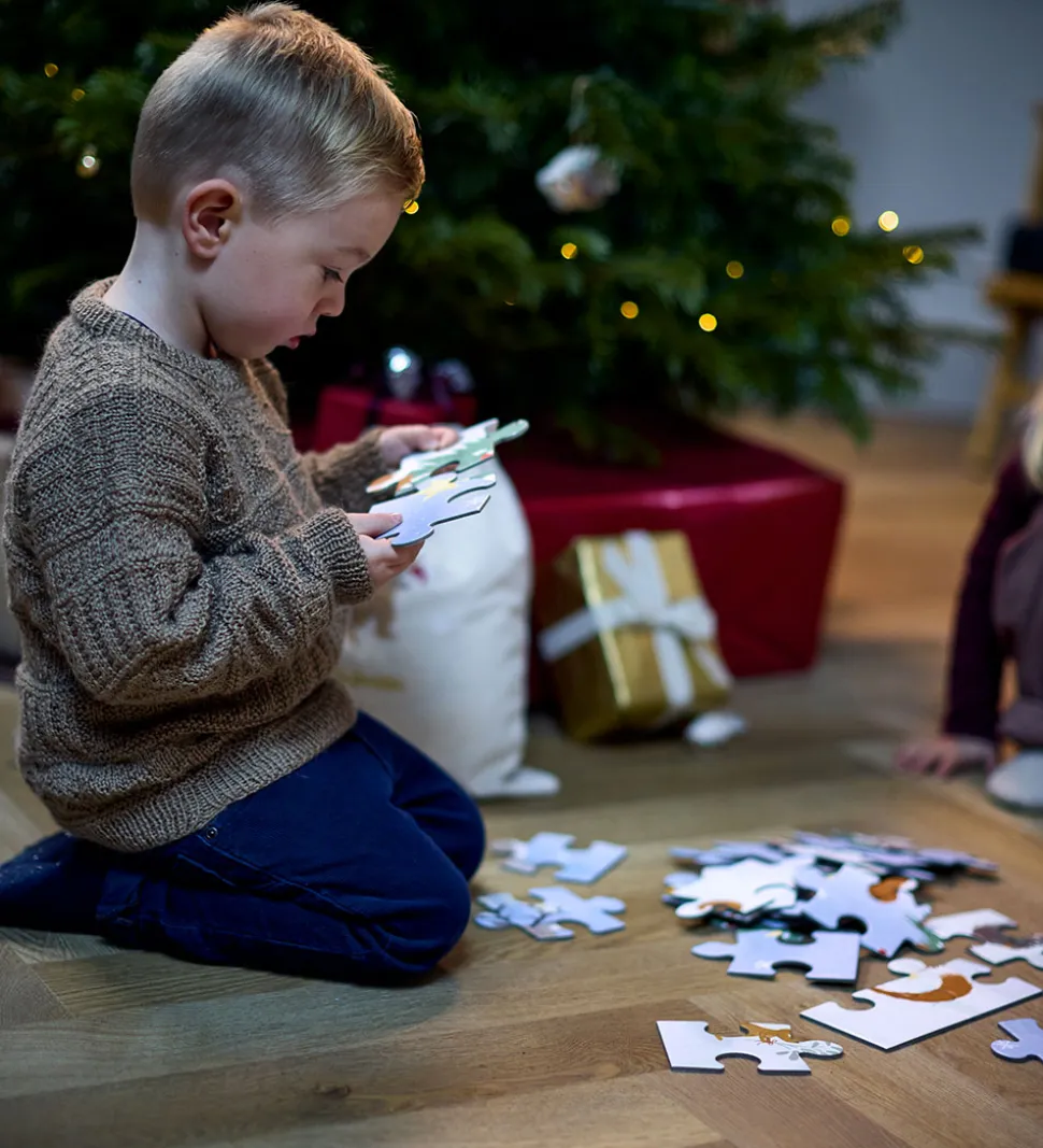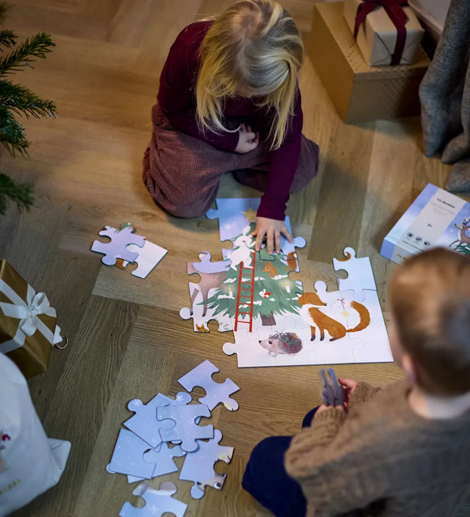 Hyggeligt Filibabba puslespil med print af et vinterlandskab, julemotiver og søde dyr i flotte farver. Puslespillet består af 30 brikker.