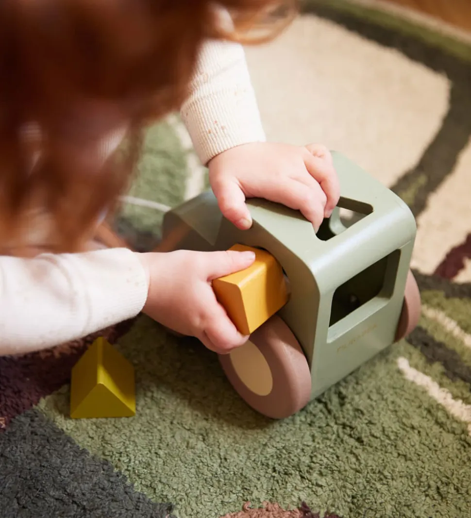 Filibabba puttekassen har tre huller i hver sin form, der passer til de medfølgende træklodser. Traktorens hjul kan dreje rundt, og der er en snor fortil, så den kan trækkes med.