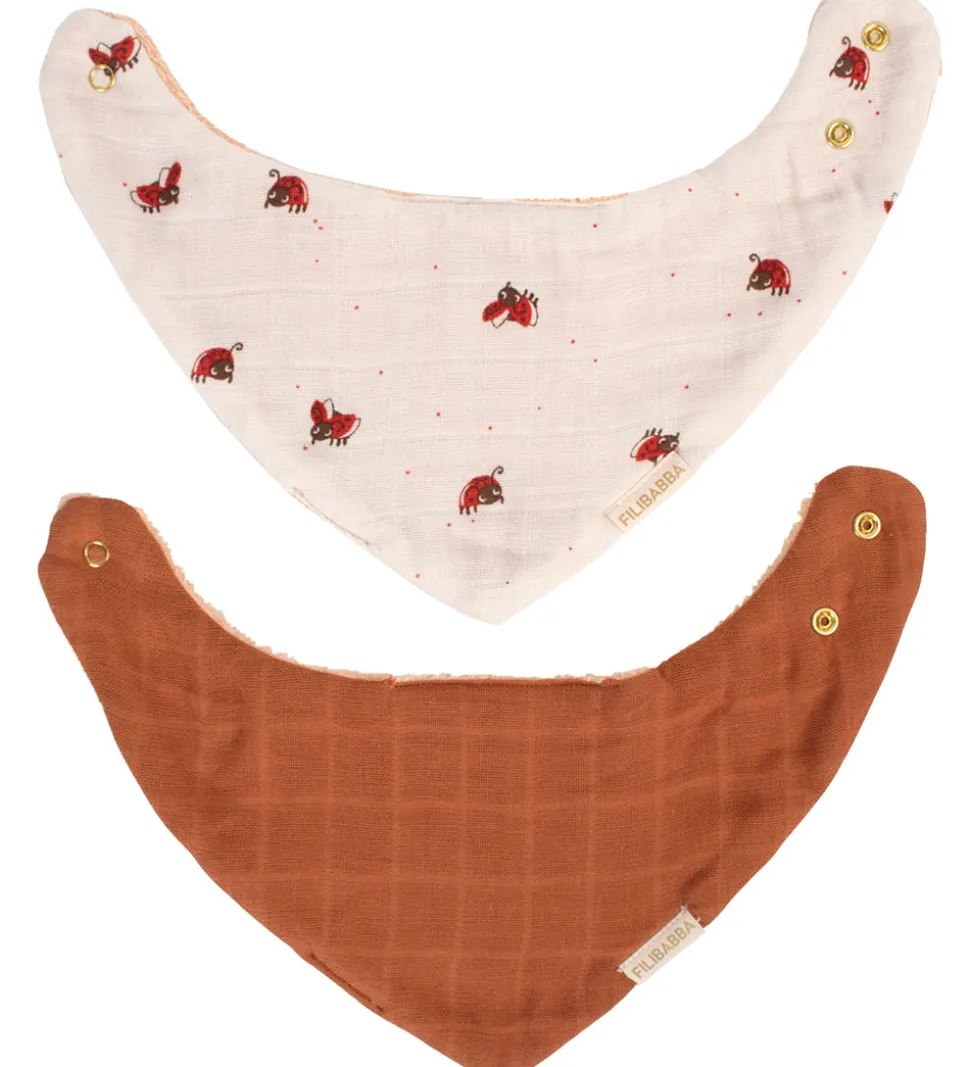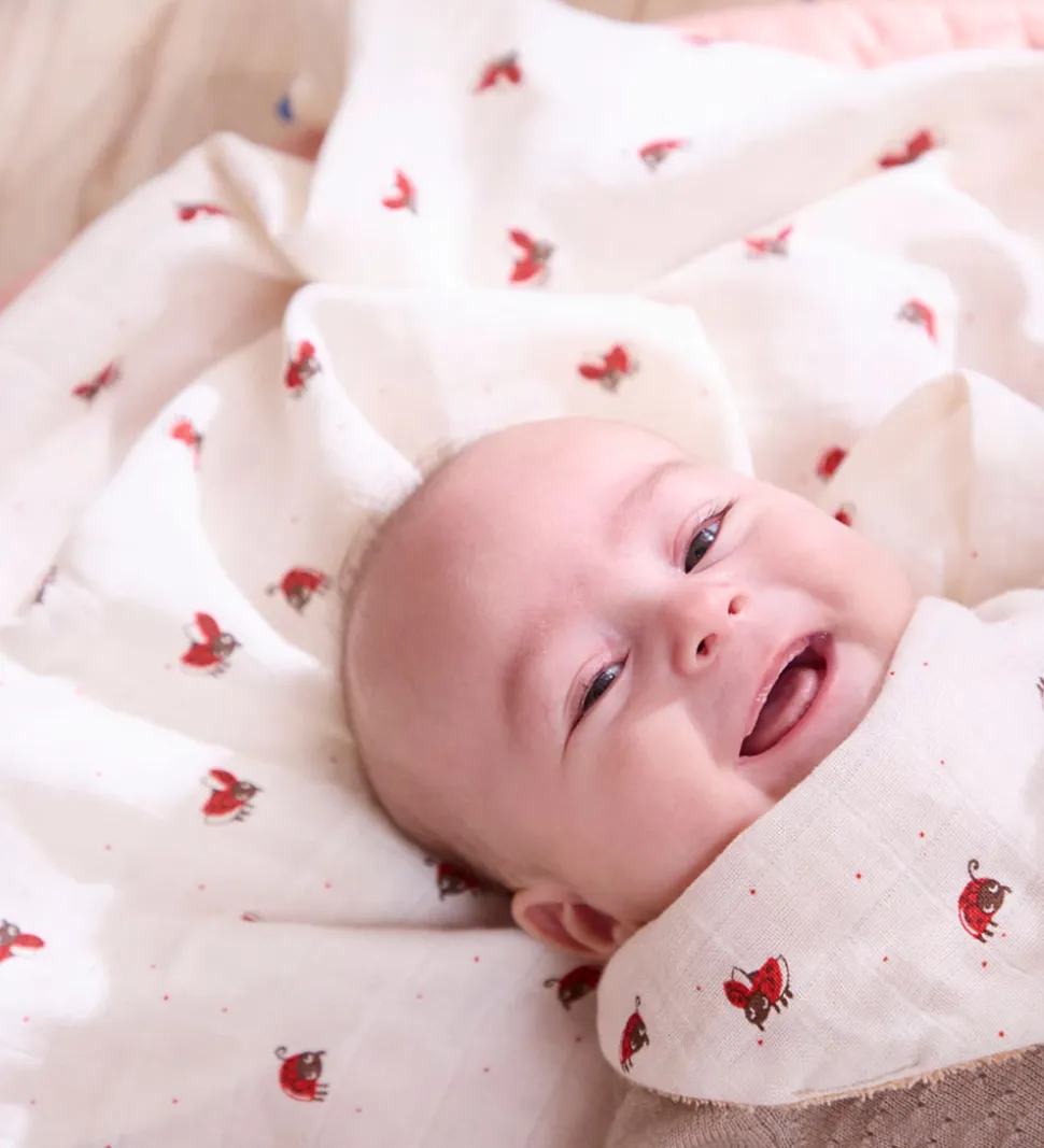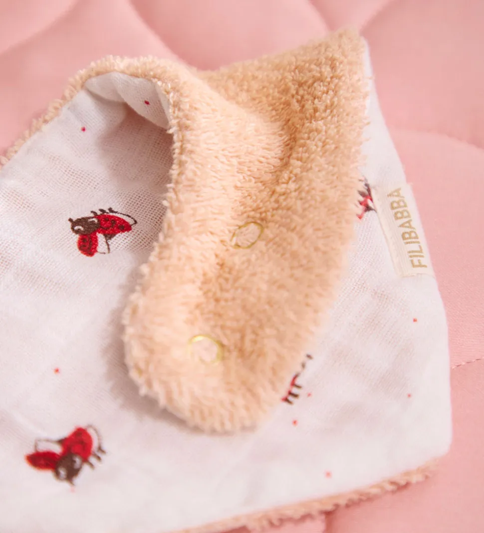 - Hvidt musselin med print af mariehøns på den ene side, mens den anden er i beige frotté