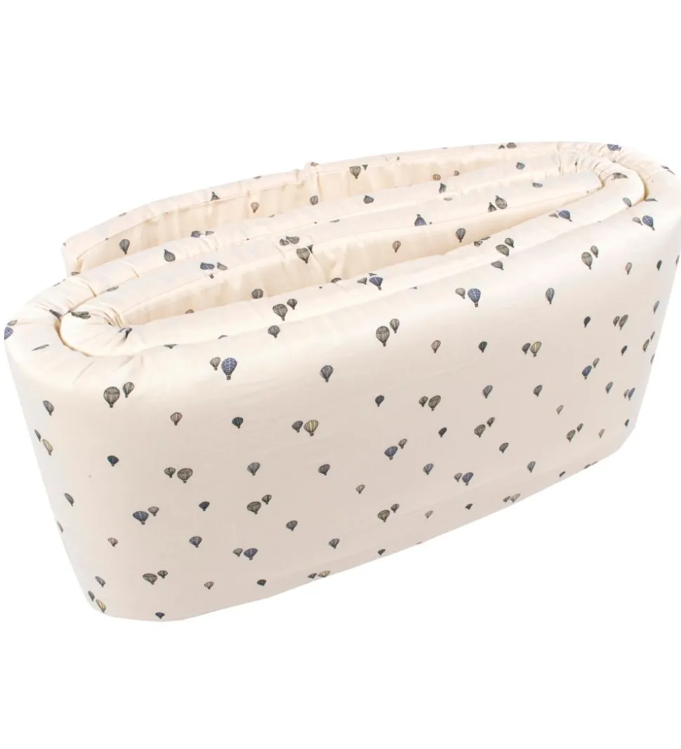 Sød Filibabba sengerand i ensfarvet cremehvid med et alloverprint af små luftballoner i forskellige farver.
