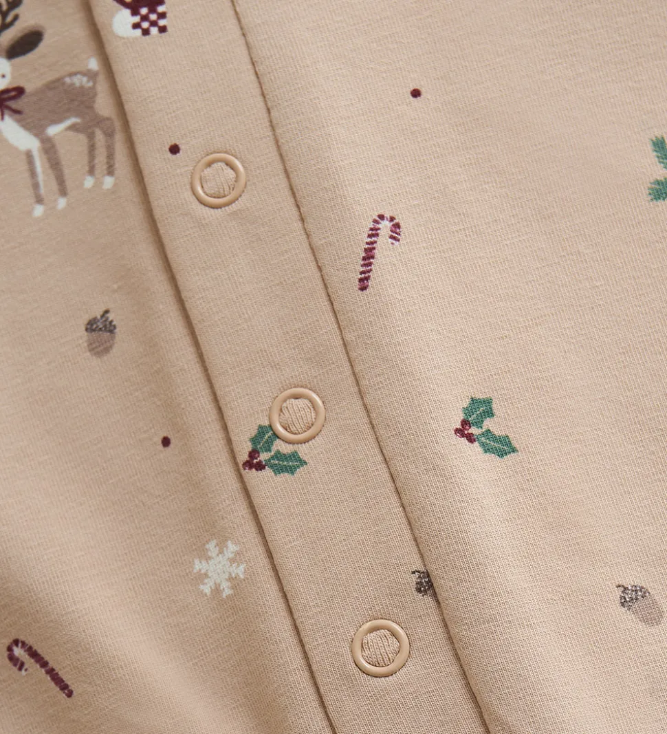Charmerende Fixoni heldragt i en rolig, beige nuance med et yndefuldt print af rensdyr, snefnug og julekæppe.