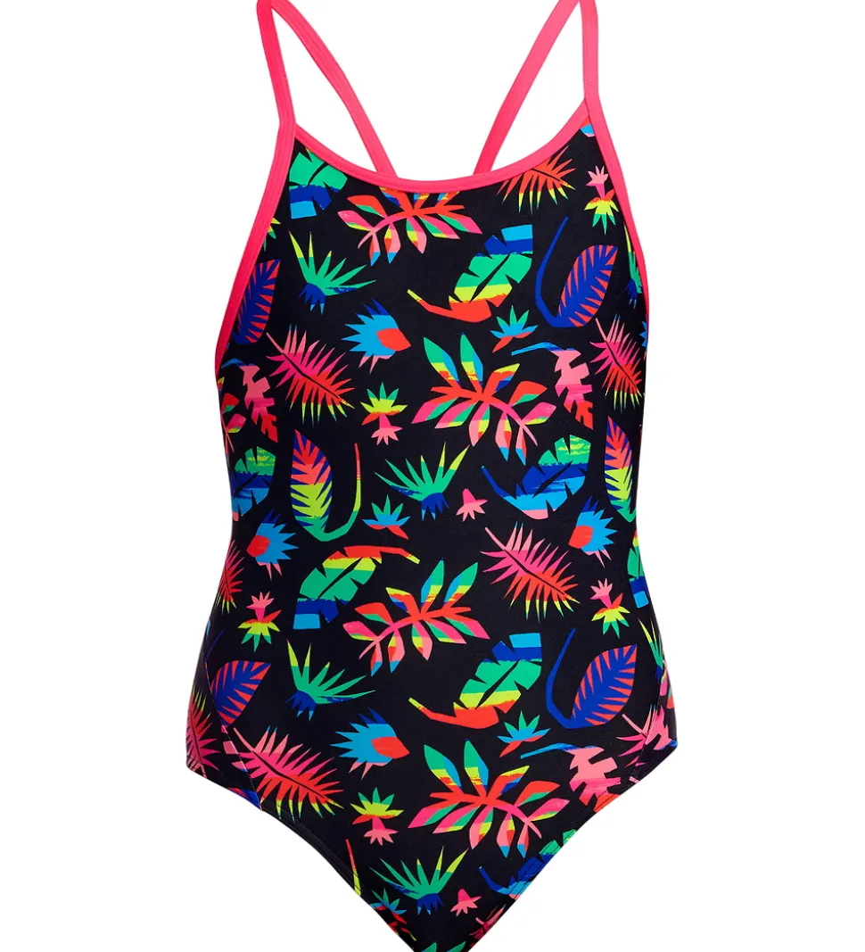 Festlig Funkita badedragt med et iøjnefaldende print af farverige blade og fjer i neonfarver på en sort baggrund. Mønstret består af levende pink, blå, grønne og orange nuancer, der skaber et dynamisk udseende.