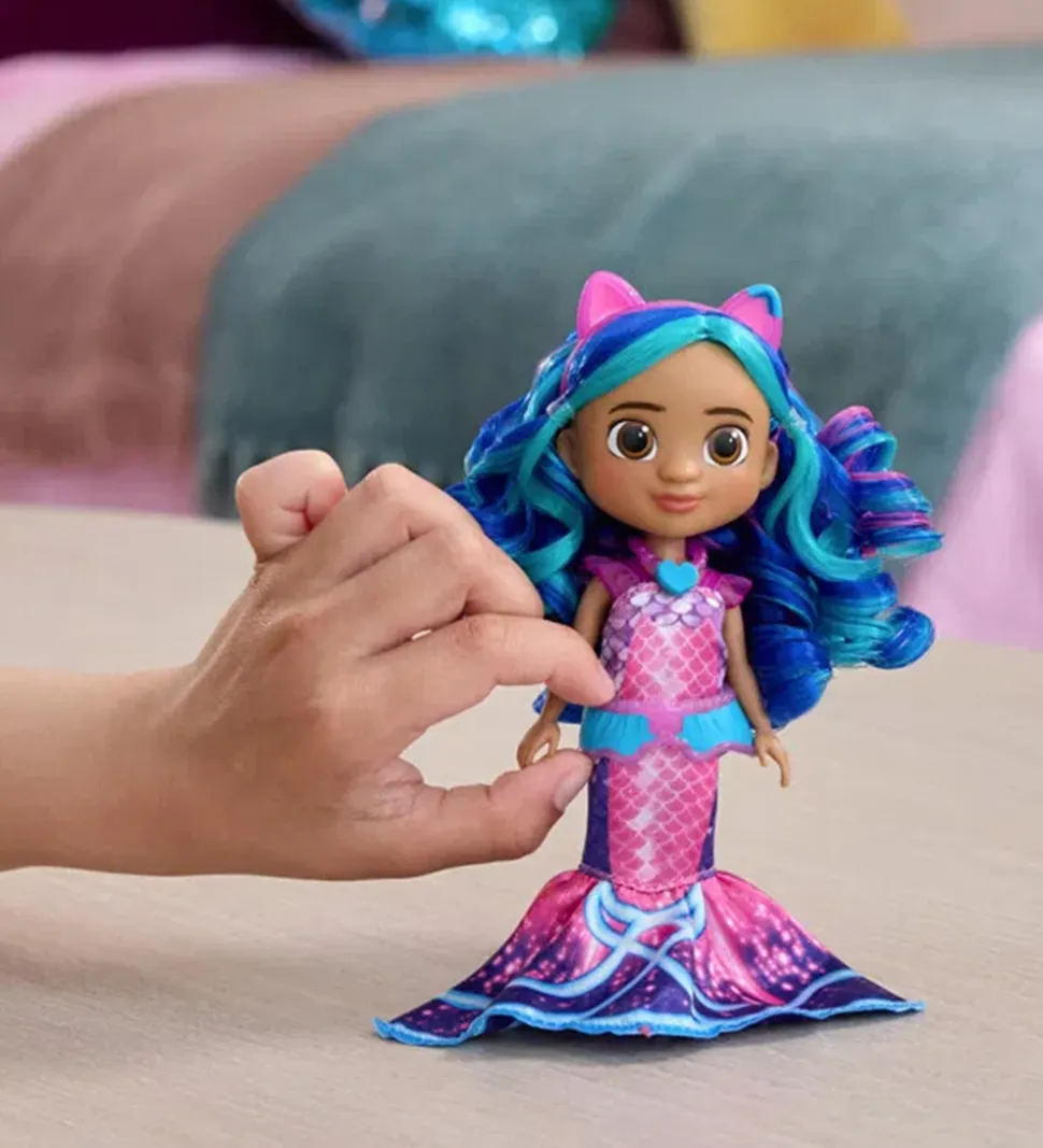 Charmerende Gabby’s Dollhouse legetøjsfigur med langt, bølget hår i blå og turkise farver. Figuren bærer en flot, lilla havfruekjole med print, og der medfølger en halskæde og et mavebælte. Perfekt til små fans af Gabby’s Dollhouse.