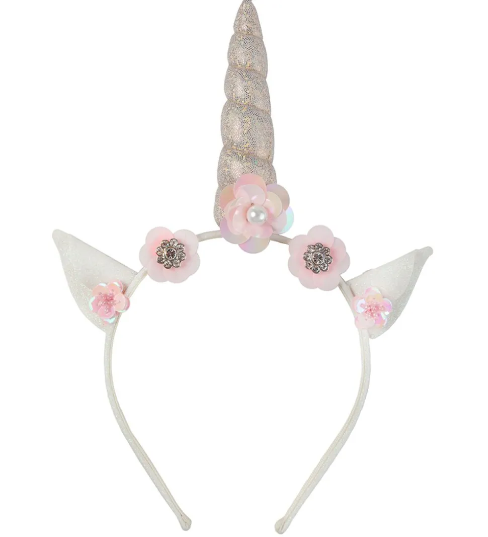 Sød Great Pretenders hårbøjle med fine ører med glimmer og horn. Der er også smukke blomster i rosa nuancer med flotte sten og perler.