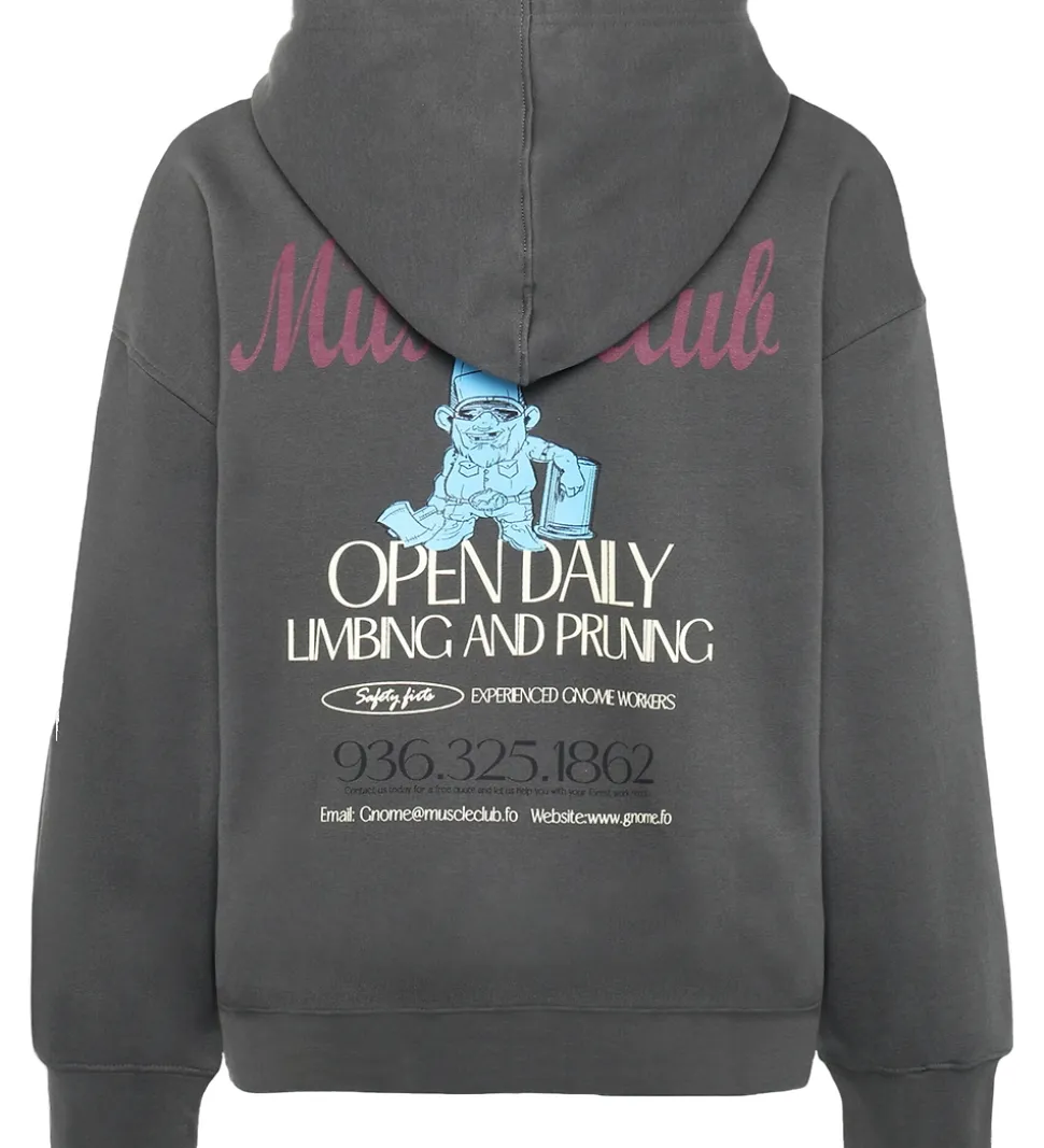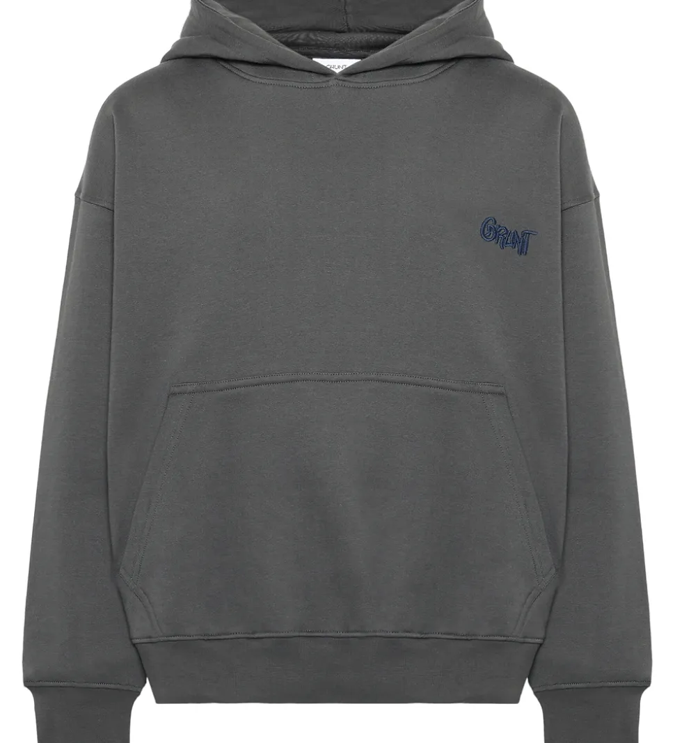 Smart Grunt hættetrøje i mørkegrå med et broderet logo på venstre bryst i mørkeblå. Rå ryggen er der et stort print af en blå gnom og tesktprint i lilla, gul og sort. Hættetrøjen har en blød hætte og en rummelig kængurulomme på fronten. Den har lange ærmer med brede ribkanter, og indvendigt er der blødt, børstet bomuld.