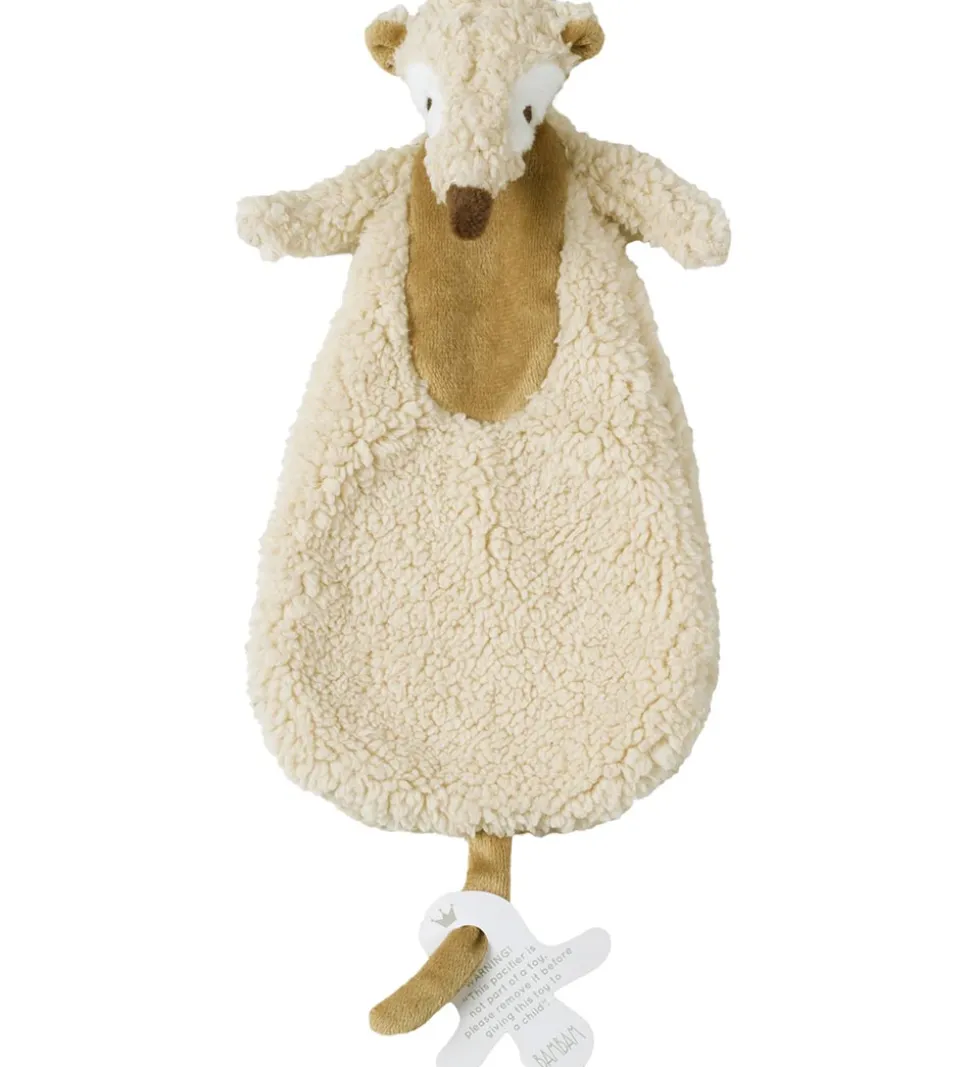 Happy Horse suttekluden er dejlig at putte med, og dens hale er en snor, hvor sutten kan sættes fast.