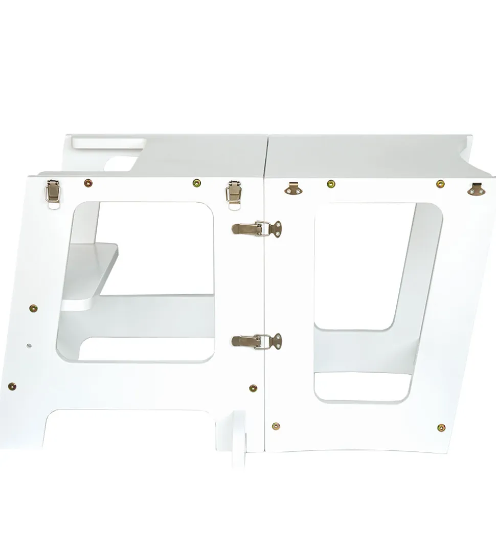 Læringstårnet har et trappetrin, så barnet selv kan komme op at stå i tårnet, og trappetrinnet kan justeres i to højder, så det passer bedst til barnet. På to af benene sidder der et par ‘vinger’, som sikrer at læringstårnet står stabilt og sikkert på gulvet.