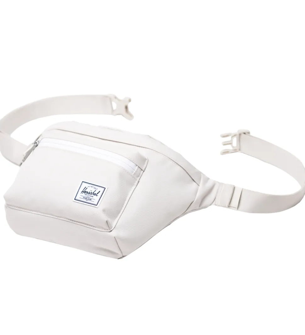 Fin Herschel bæltetaske i ensfarvet off-white med et logo på fronten. Bæltetasken har en flot facon, og består af tre rum, som alle åbnes med lynlås. I det største rum er der en lomme i net indvendigt. Bæltetasken har en justerbar rem, som kan åbnes med et klik-spænde. Den kan bæres omkring livet eller som en cross-body taske over skulderen.