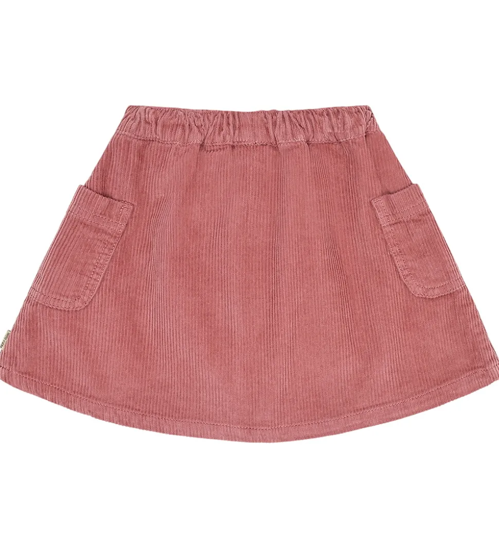 Elegant Hust and Claire nederdel i en varm, rosa farve med blød fløjlstruktur. Hust and Claire nederdelen har en juster, elastisk talje og knapper fortil. Den har praktiske lommer på siderne.
