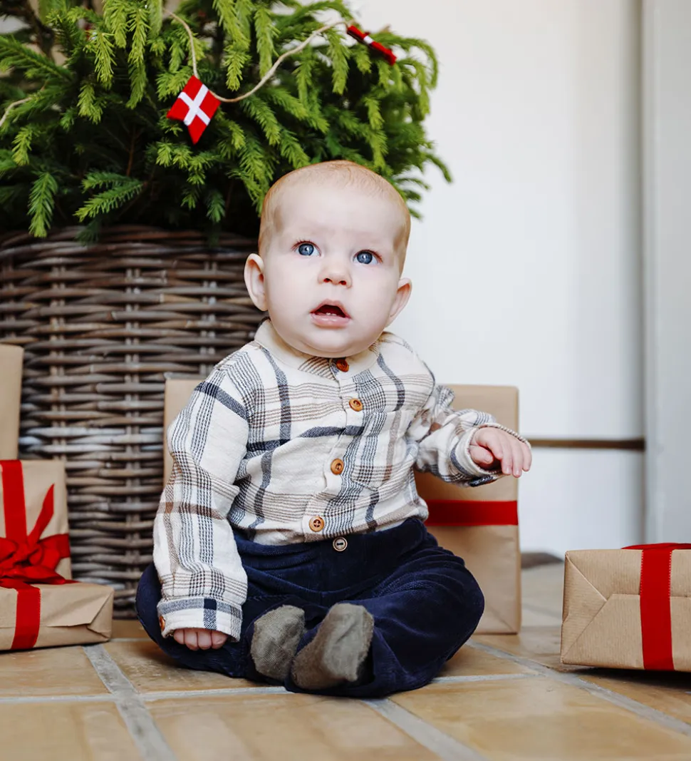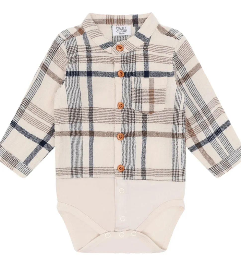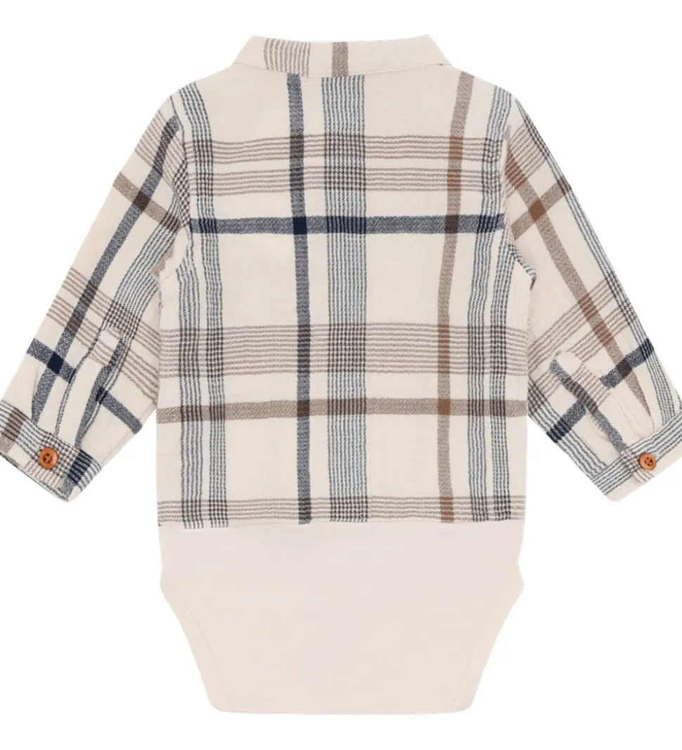 Flot Hust and Claire skjortebody i creme med et ternet mønster i brun og navy. I toppen er den lavet i en fastvævet kvalitet, og i bunden er den lavet bomuldsjersey. Skjortebodyen har lange ærmer med brede kanter og en enkelt manchetknap, og i halsåbningen har den en kinakrave. I venstre side sidder der en brystlomme. Skjortenbodyen åbnes ned ad fronten med knapper, og mellem benene er der trykknapper.