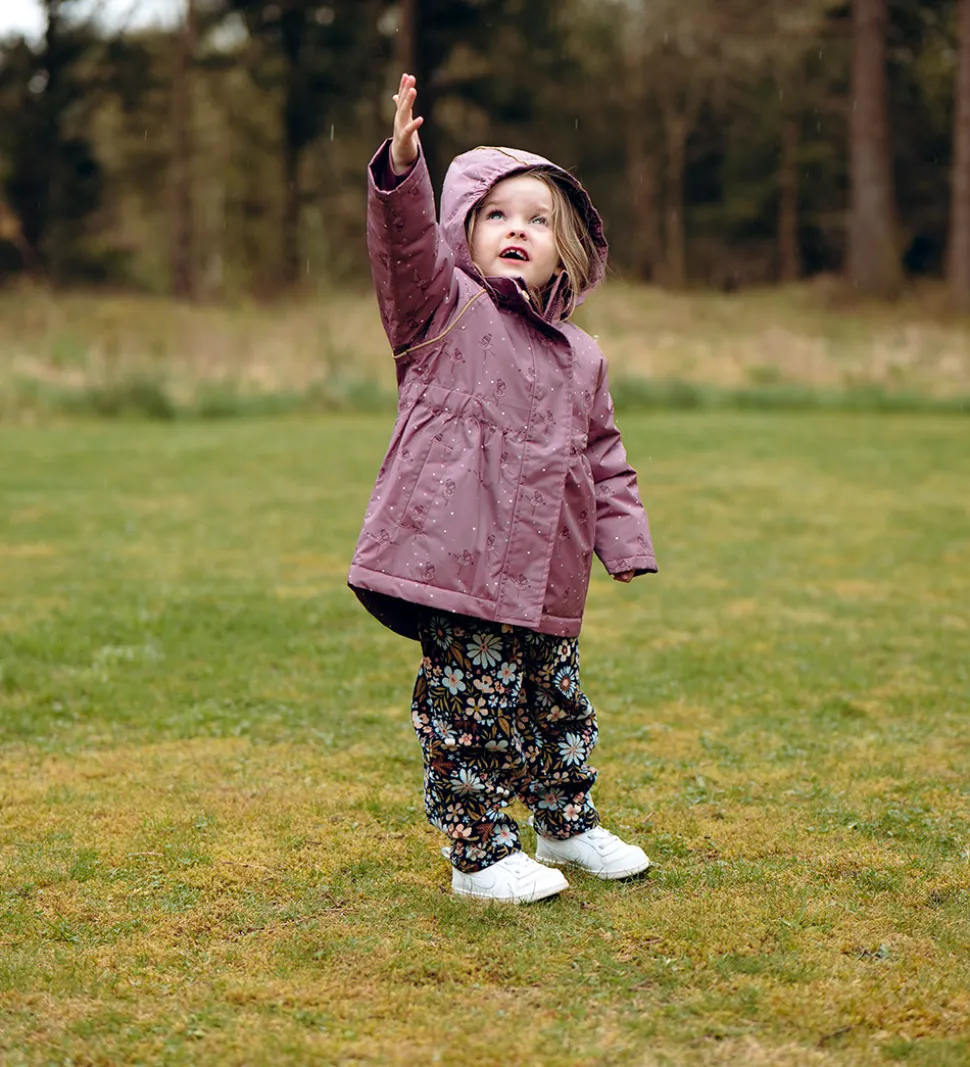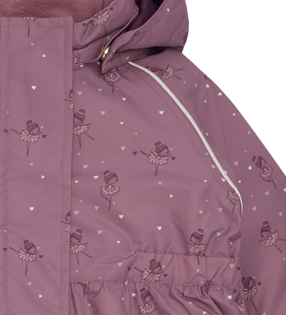 Fin Hust and Claire vinterjakke i mørk lilla med alloverprint af hjerter og ballerinaer. Vinterjakken har praktiske reflekspipings og -detaljer på velplacerede steder.